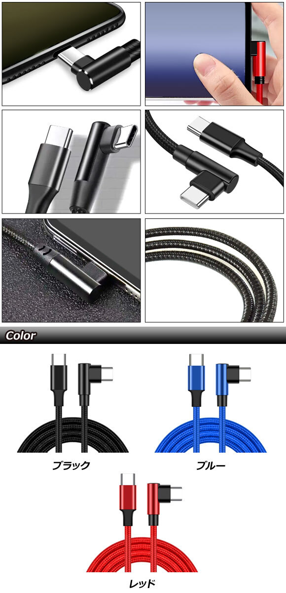 USB Type-Cケーブル ブラック 3m 60W ナイロン編みタイプ オス-オス L字&I字型 PD急速充電対応 AP-UJ0999-BK-3M