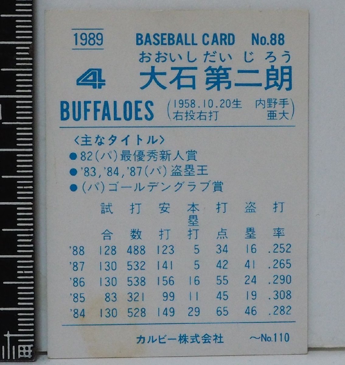 89年 カルビー プロ野球カード No.88 エラー【大石 第二朗 内野手 近鉄バファローズ】平成元年 1989年 当時物 Calbeeおまけ食玩【中古】
