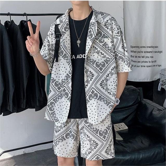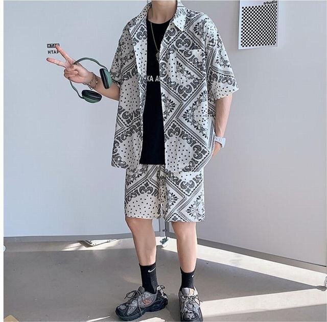 LRM1508★夏物 メンズ セットアップ ペイズリー柄 上下セット ペイズリー バンダナ 涼しい 半袖シャツ