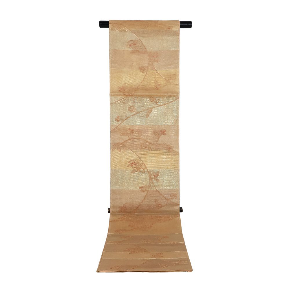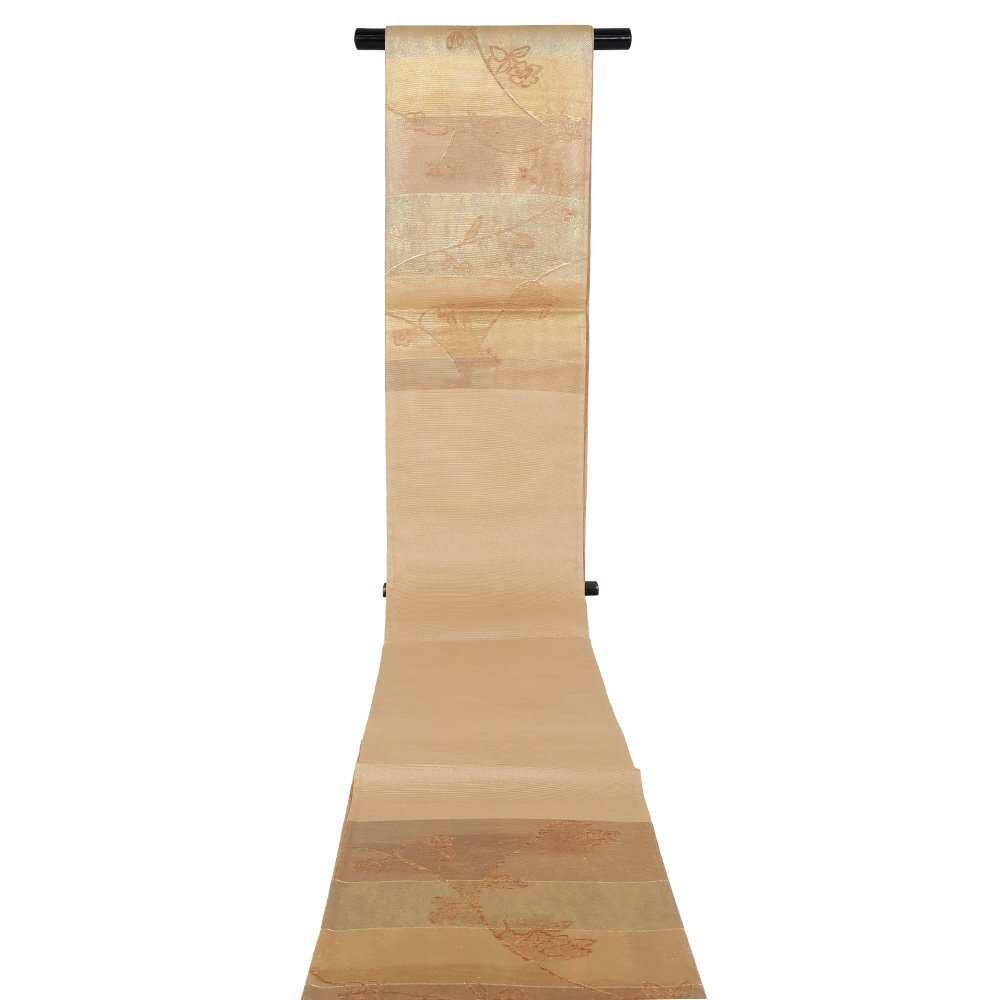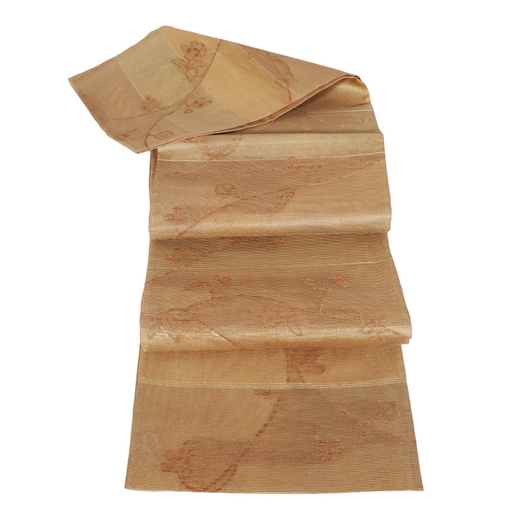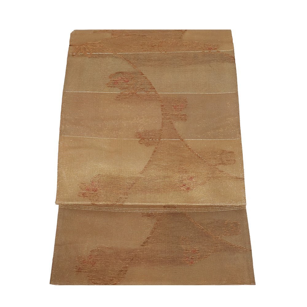 | 紗 西陣織袋帯 彩段唐華文 茶色・緑・金箔地 唐花 未使用品 仕立て上がり | |