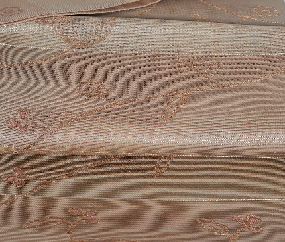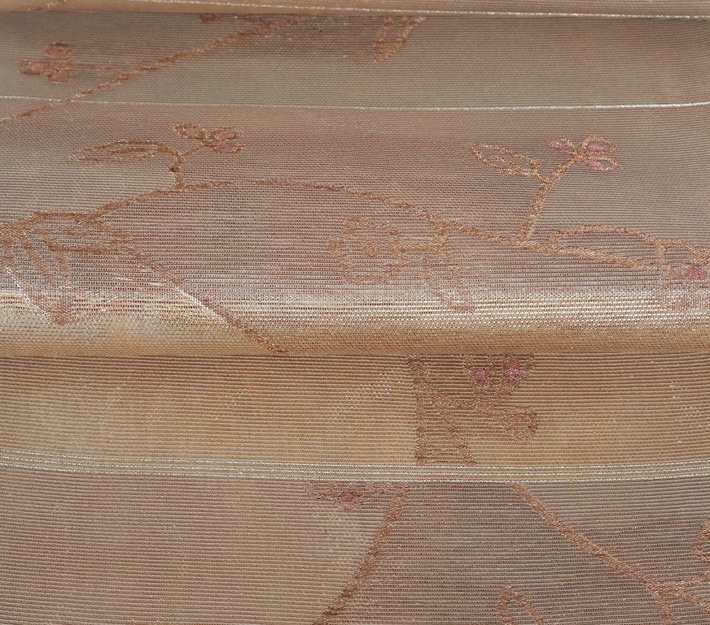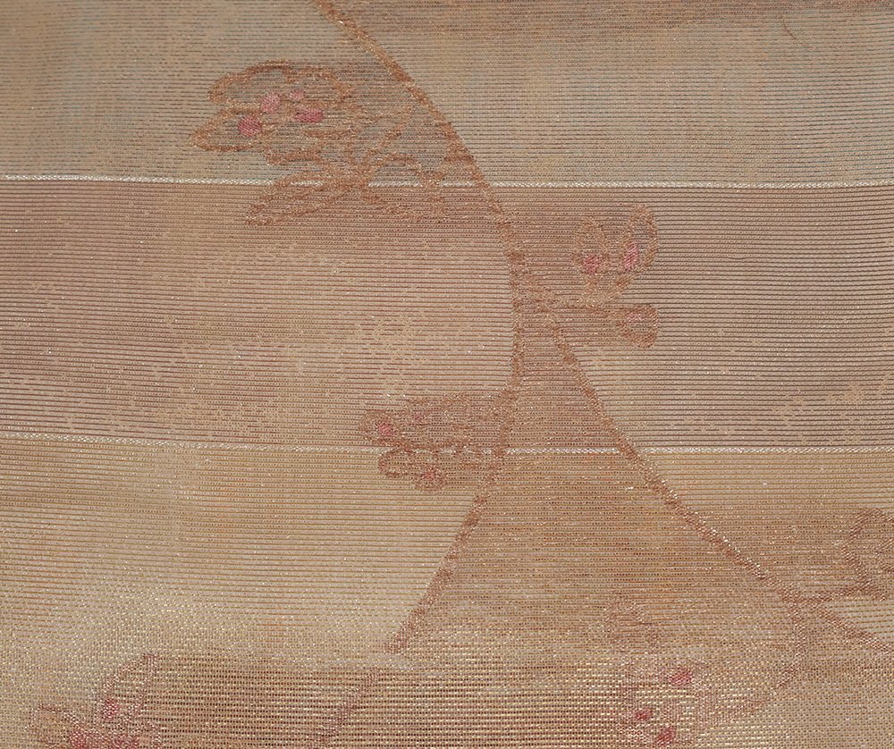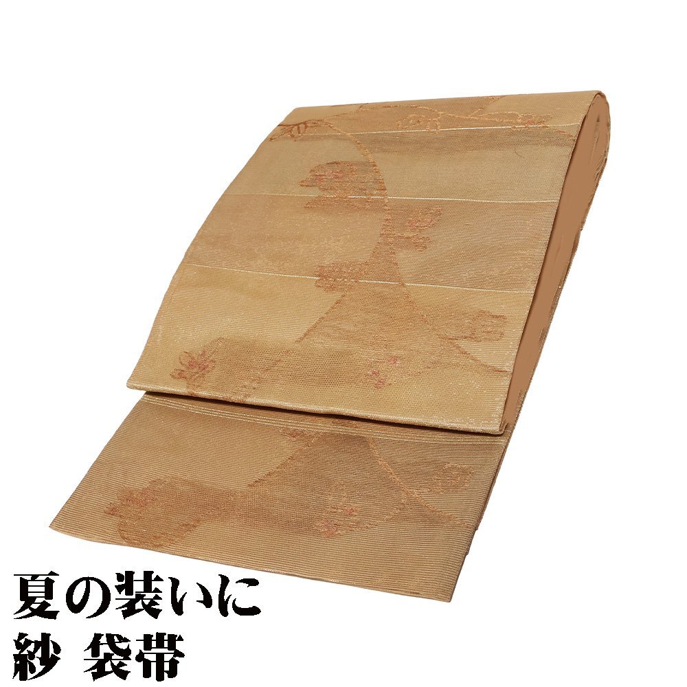 | 紗 西陣織袋帯 彩段唐華文 茶色・緑・金箔地 唐花 未使用品 仕立て上がり | |