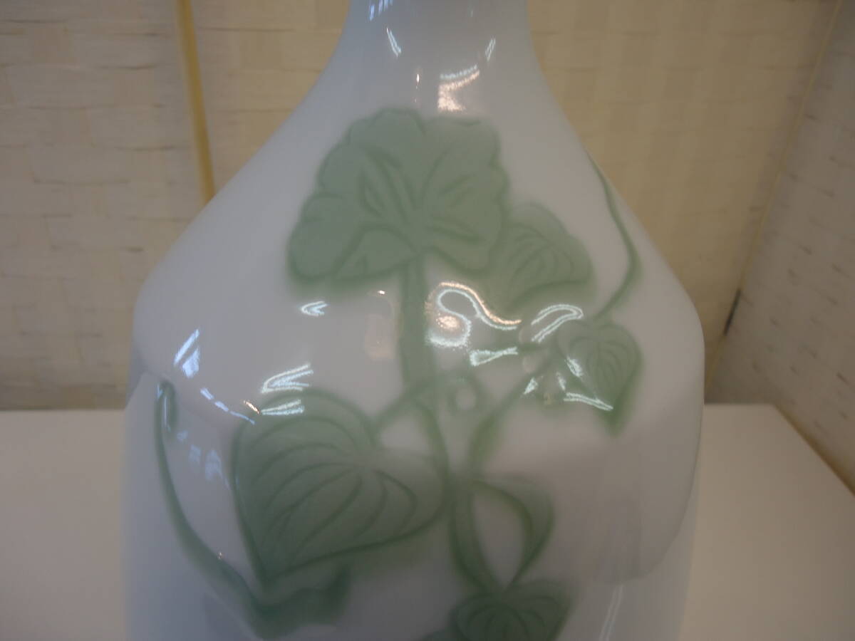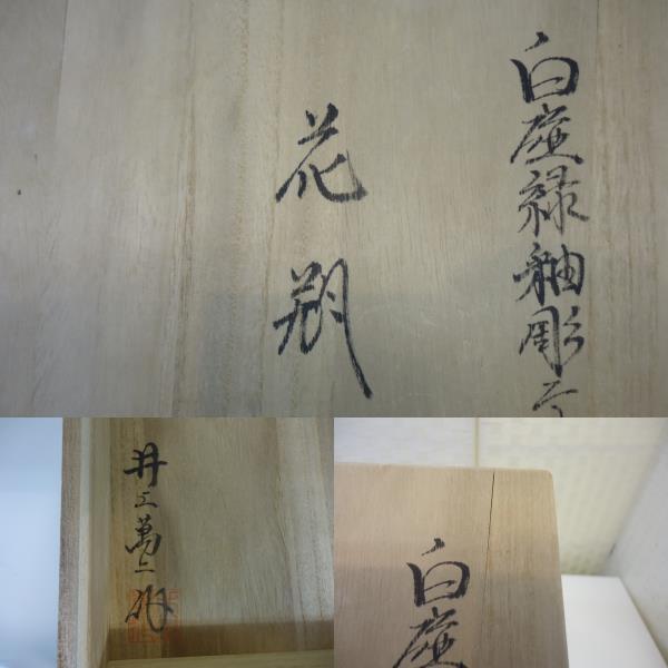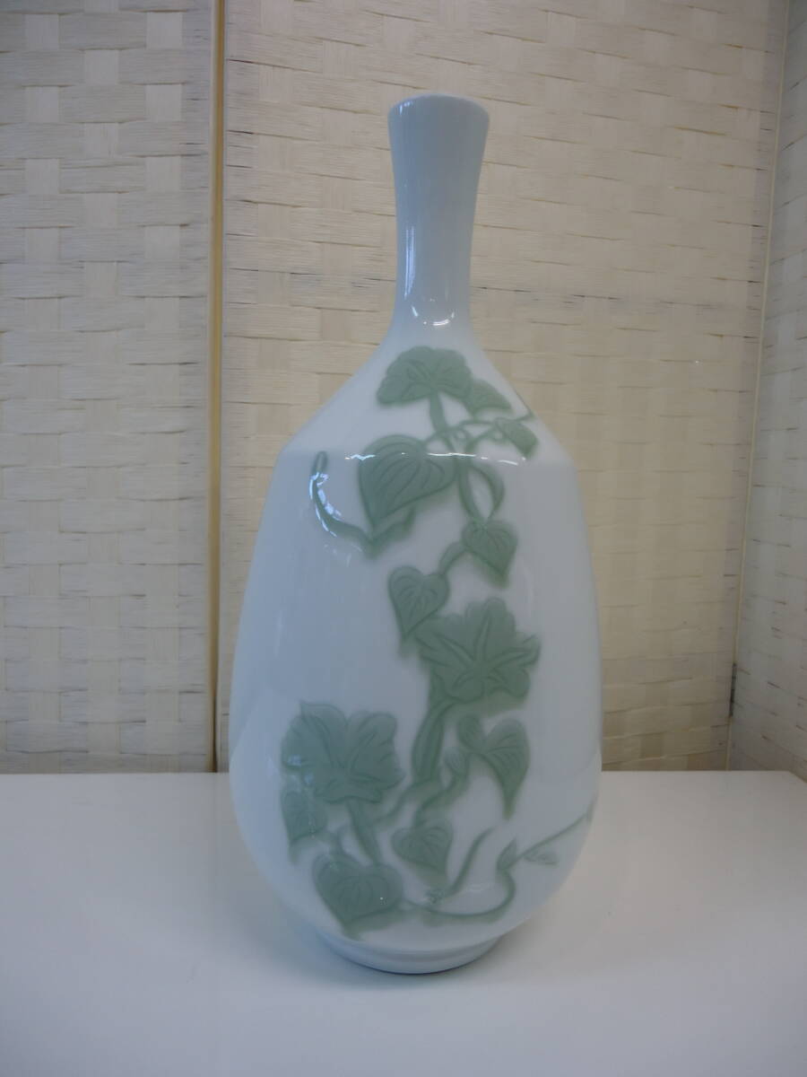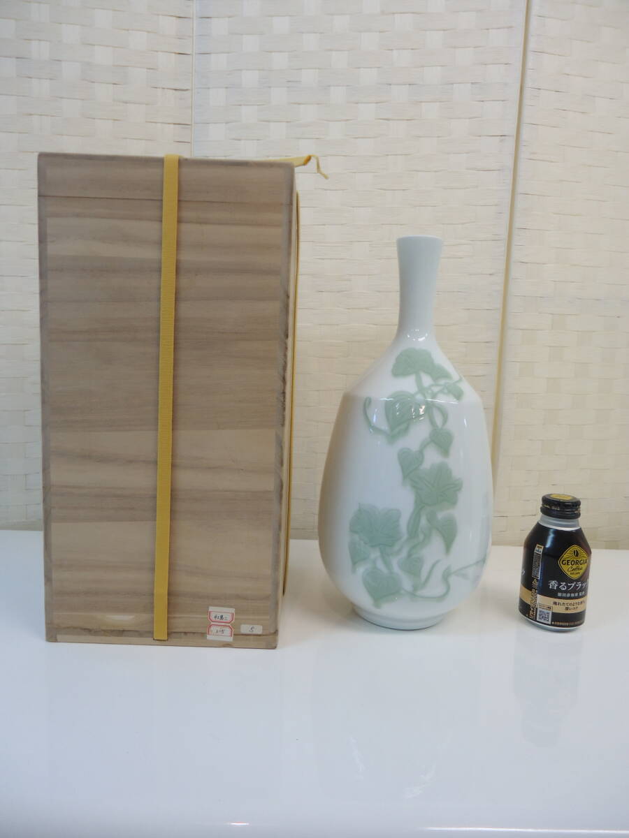 | ●○井上萬二 人間国宝 井上萬二 本人作 白磁緑釉彫文 壺 飾り壺 花瓶 花器 華道具 共箱 39.5㎝○● | |