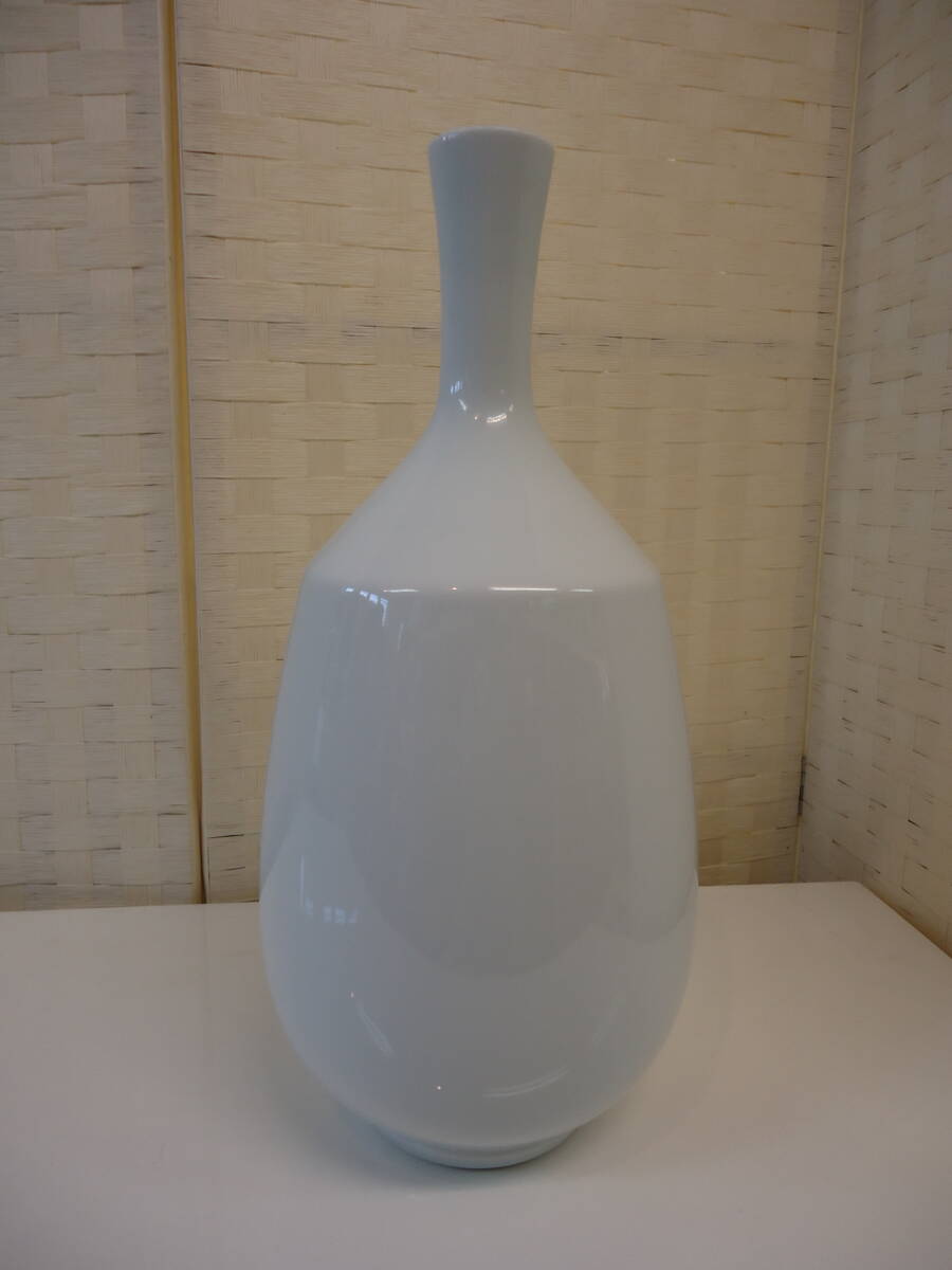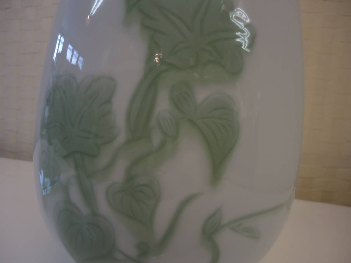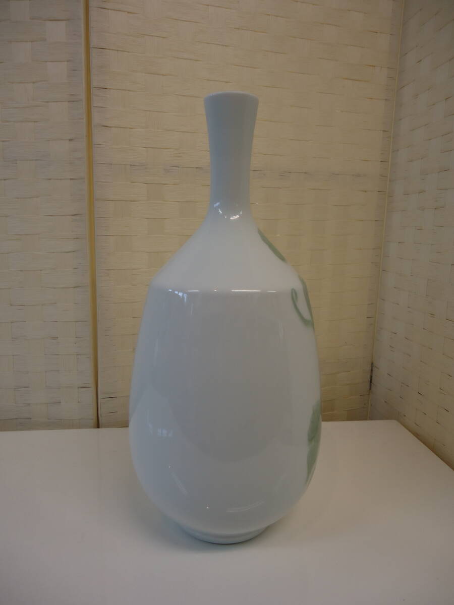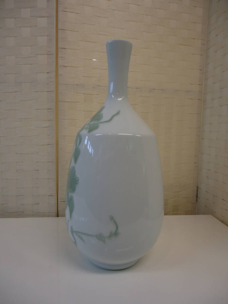 | ●○井上萬二 人間国宝 井上萬二 本人作 白磁緑釉彫文 壺 飾り壺 花瓶 花器 華道具 共箱 39.5㎝○● | |