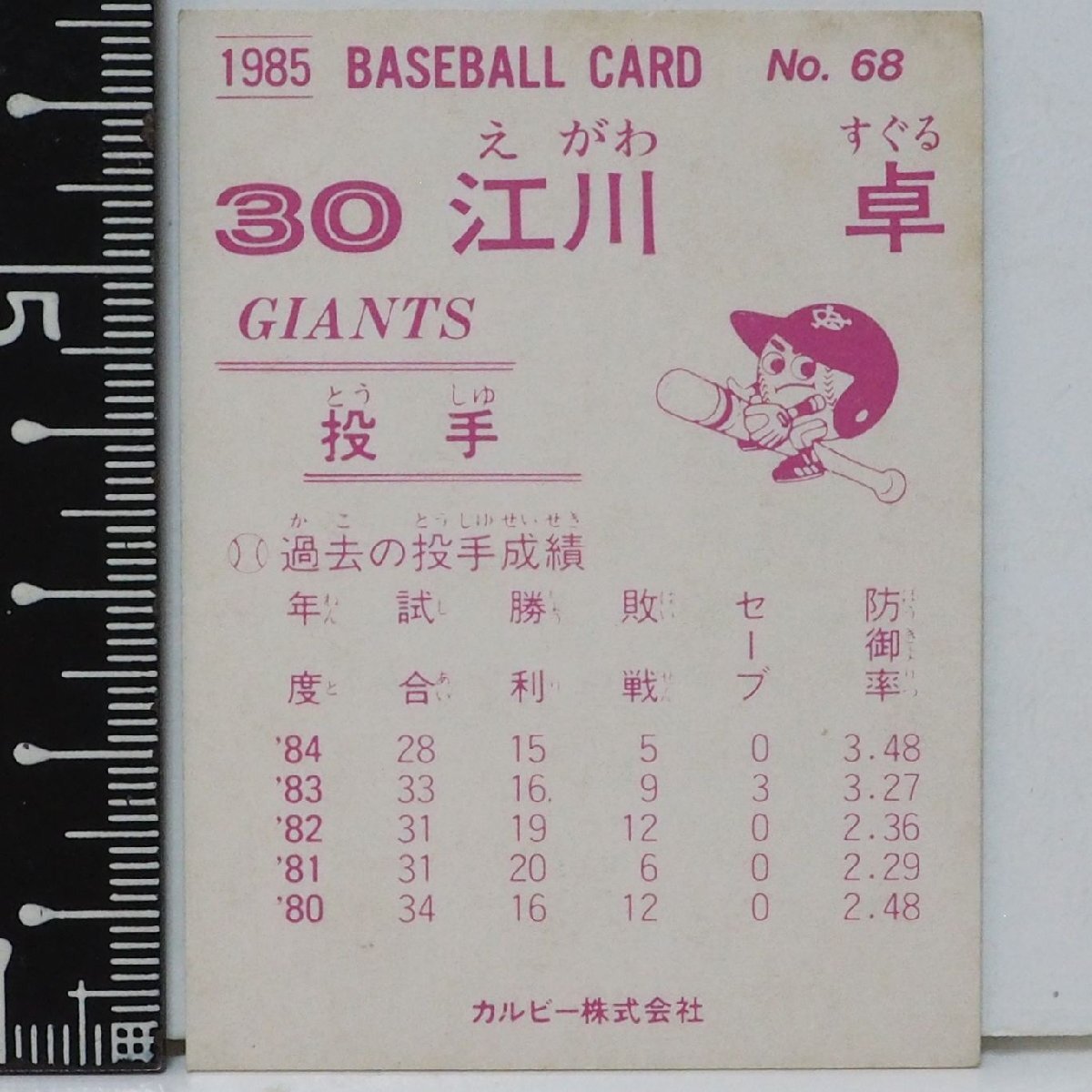 85年 カルビー プロ野球カード No.68【江川 卓 投手 読売ジャイアンツ巨人】昭和60年 1985年 当時物 Calbee おまけ 食玩 BASEBALL【中古】