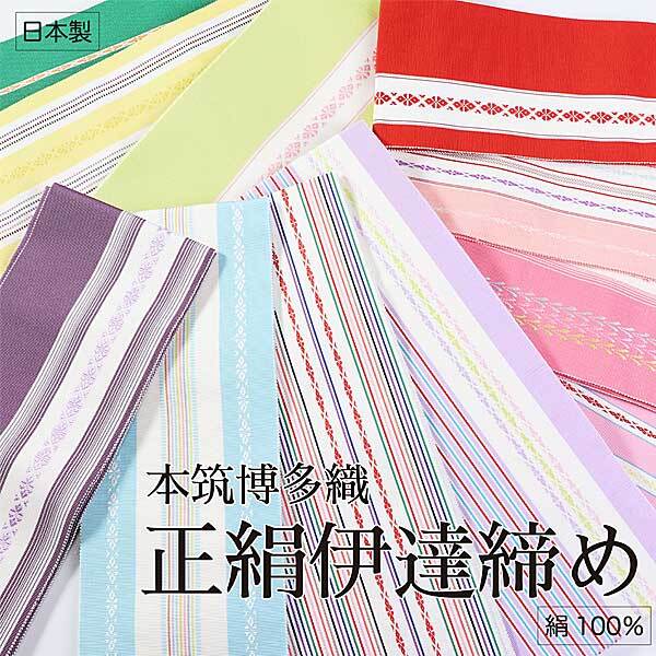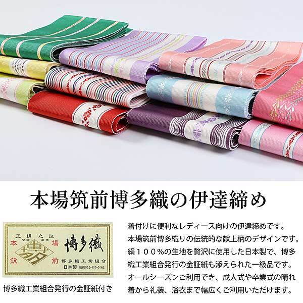 | 博多織 正絹 博多織伊達締め ゆるみがなく、締めやすい正絹伊達締めです。 着物や襦袢の生地を傷めません。 お着物をお召しの際にご使用下さい。 お着物をお召しの際にご使用下さい。 正絹ですので、ゆるむ事もなく、着心地も良い伊達締めです。 《サイズ》長さ;約228cm 幅;約10cm 《素材》 絹100% 本場筑前博多織/井上織物 ■配送方法 宅配便/メール便 ※帯ではございません | ||