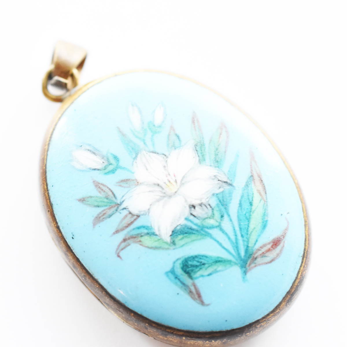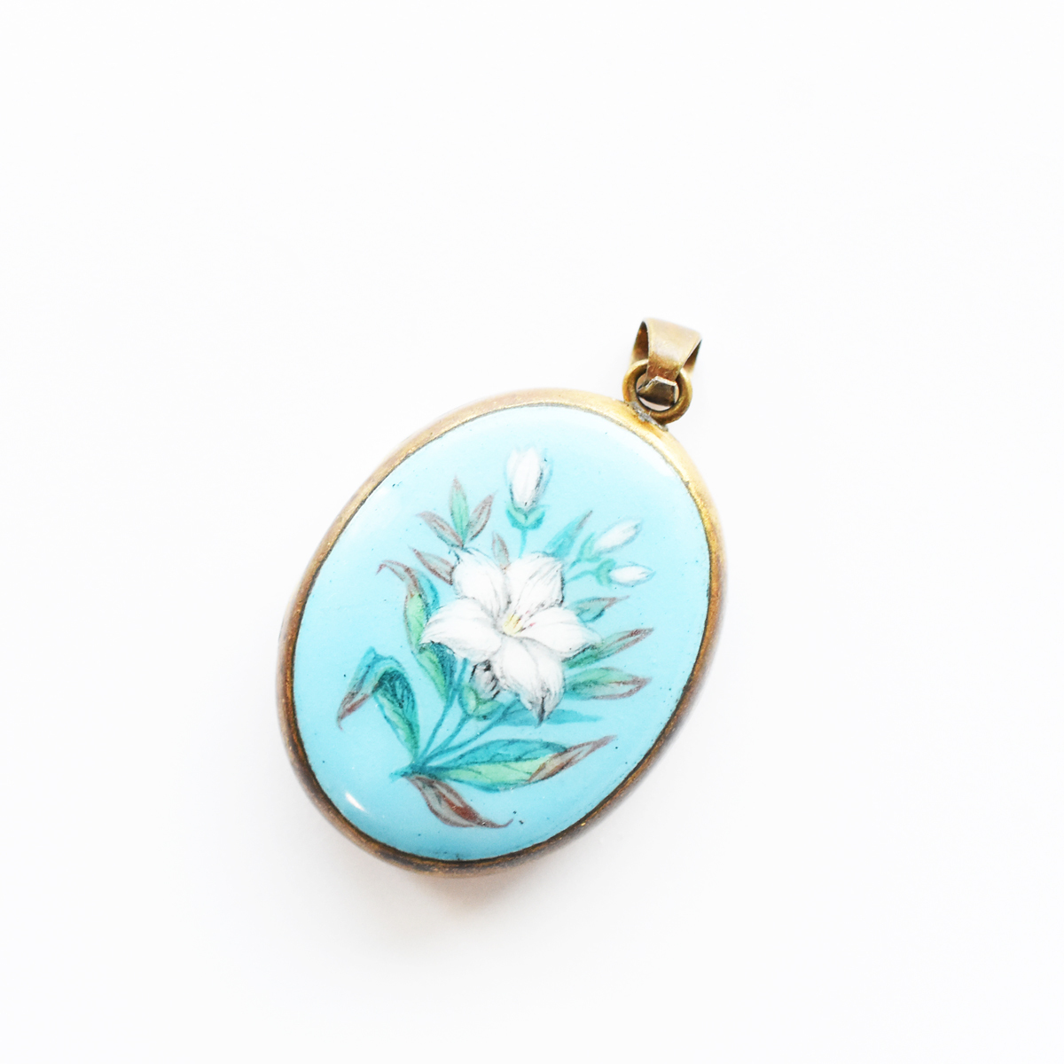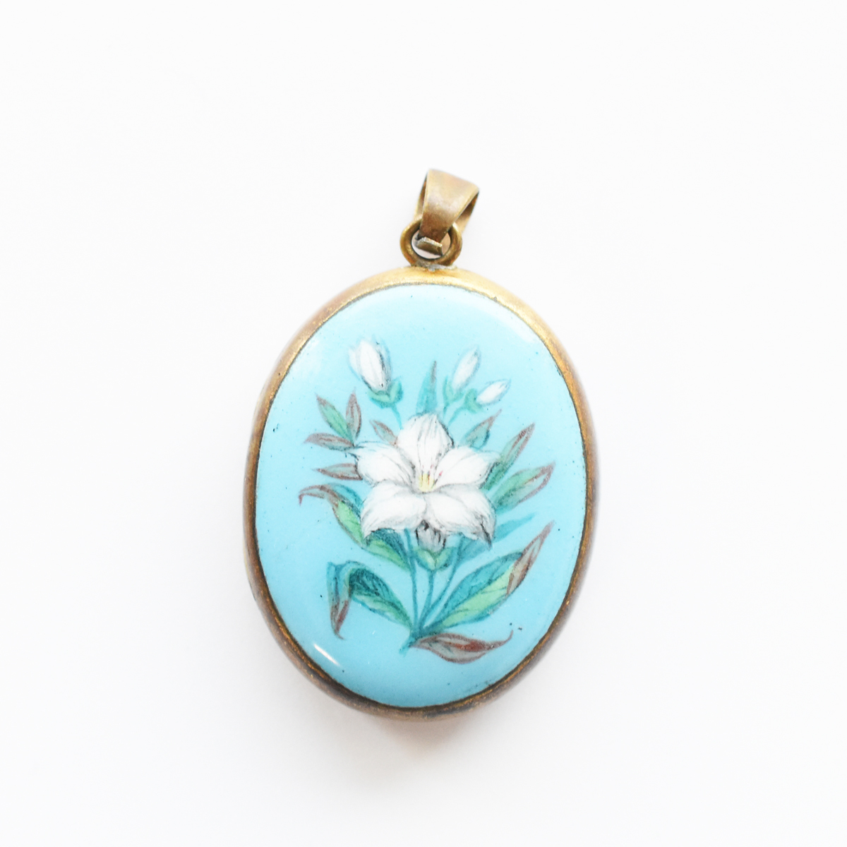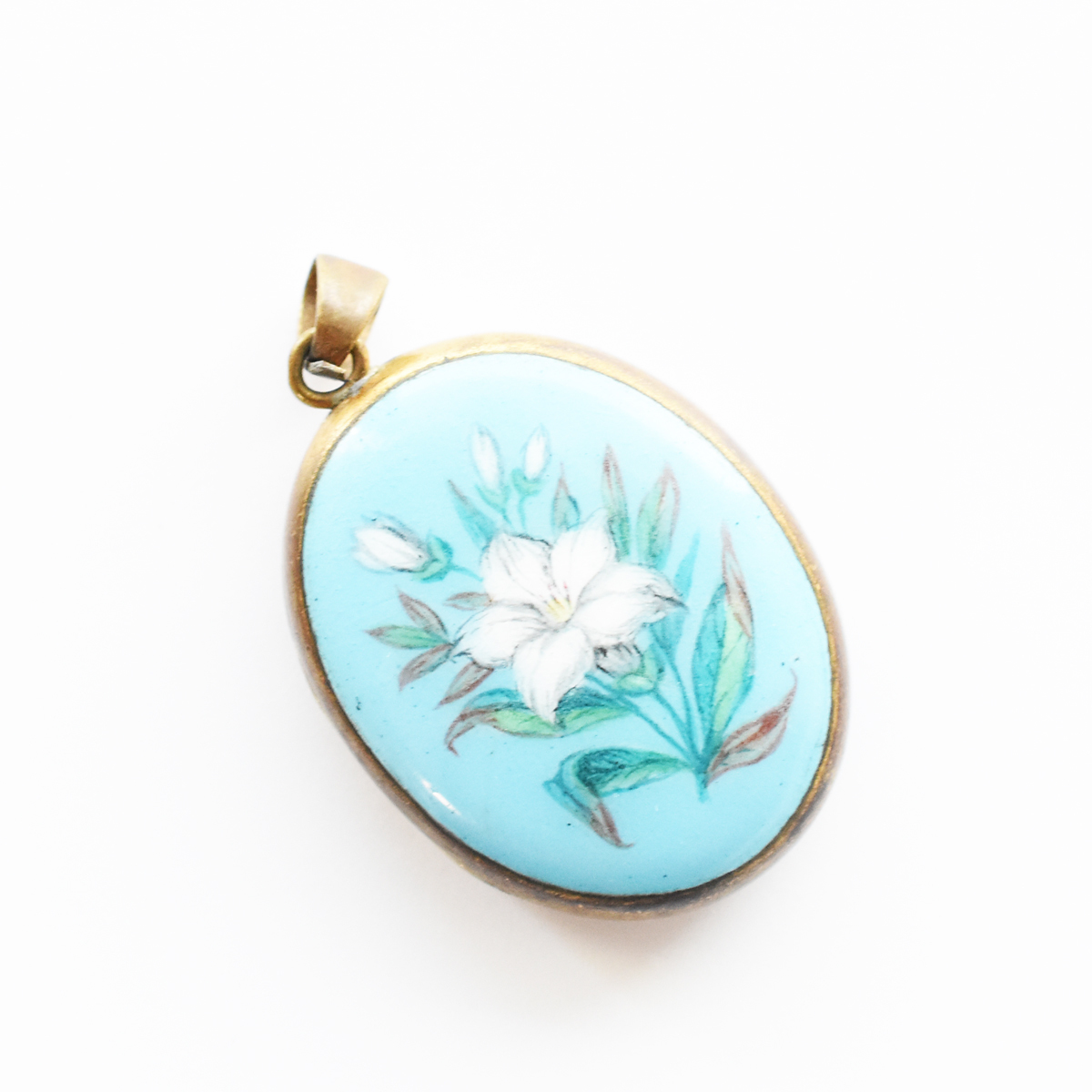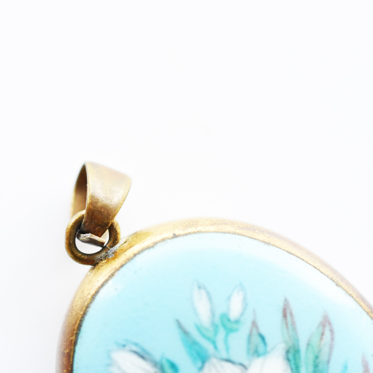 エナメル素材に手描きと思われる可憐な白い花が描かれたアンティークペンダントトップ。