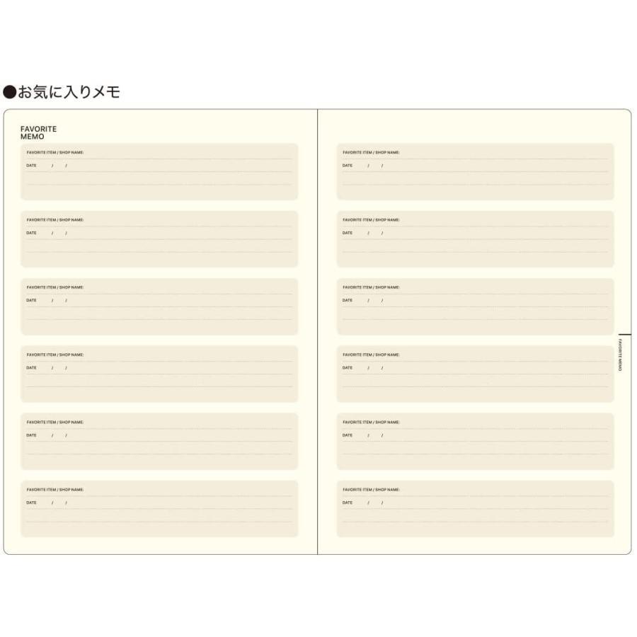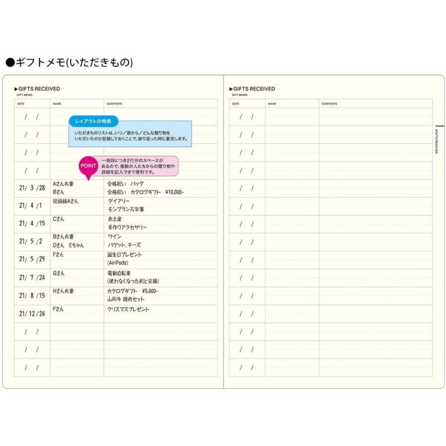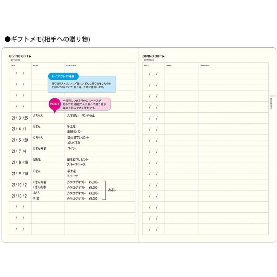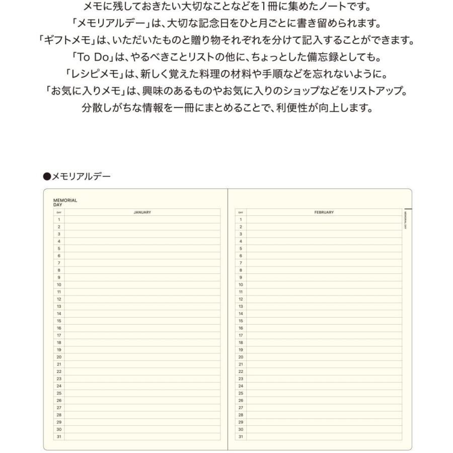 【内容】メモリアルデー記入メモ(1月〜12月)、ギフトメモ(いただいたもの、贈ったものをそれぞれ8ページずつ)、ToDoメモ6ページ、レシピメモ20ページ、お気に入りショップメモ6ページ 64ページ
