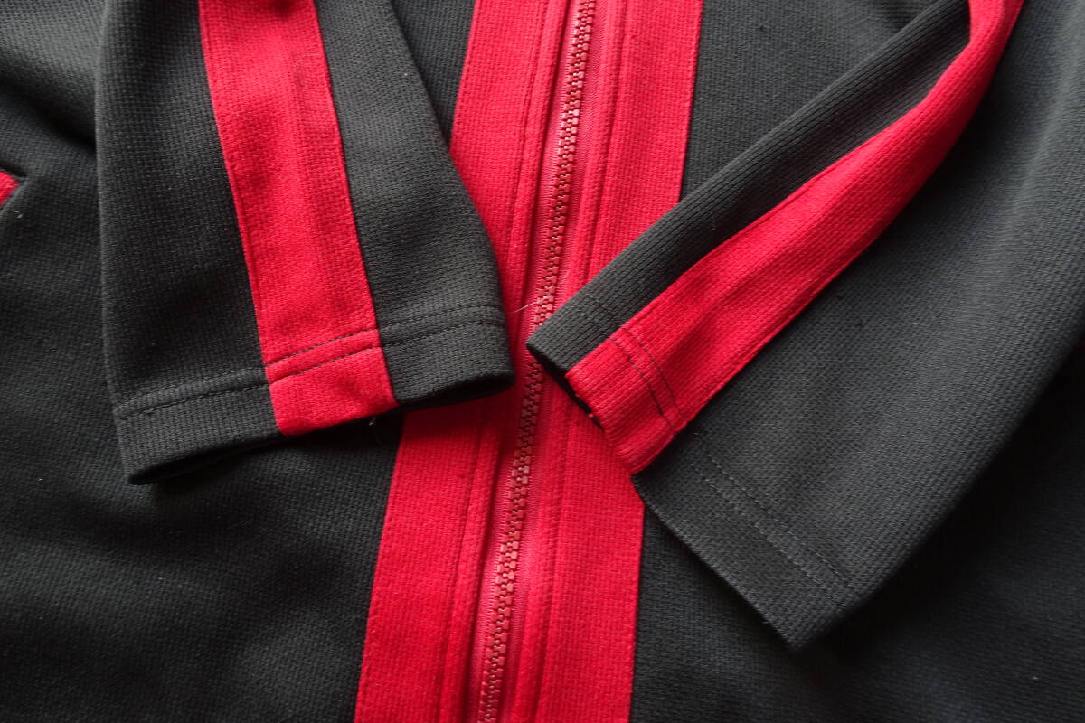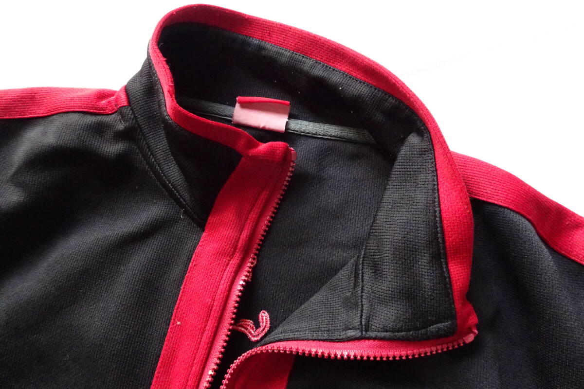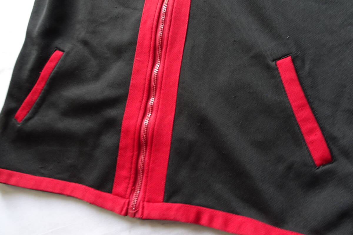 首ぐり、前ファスナー横、裾は赤ライン貼付け縫いです。