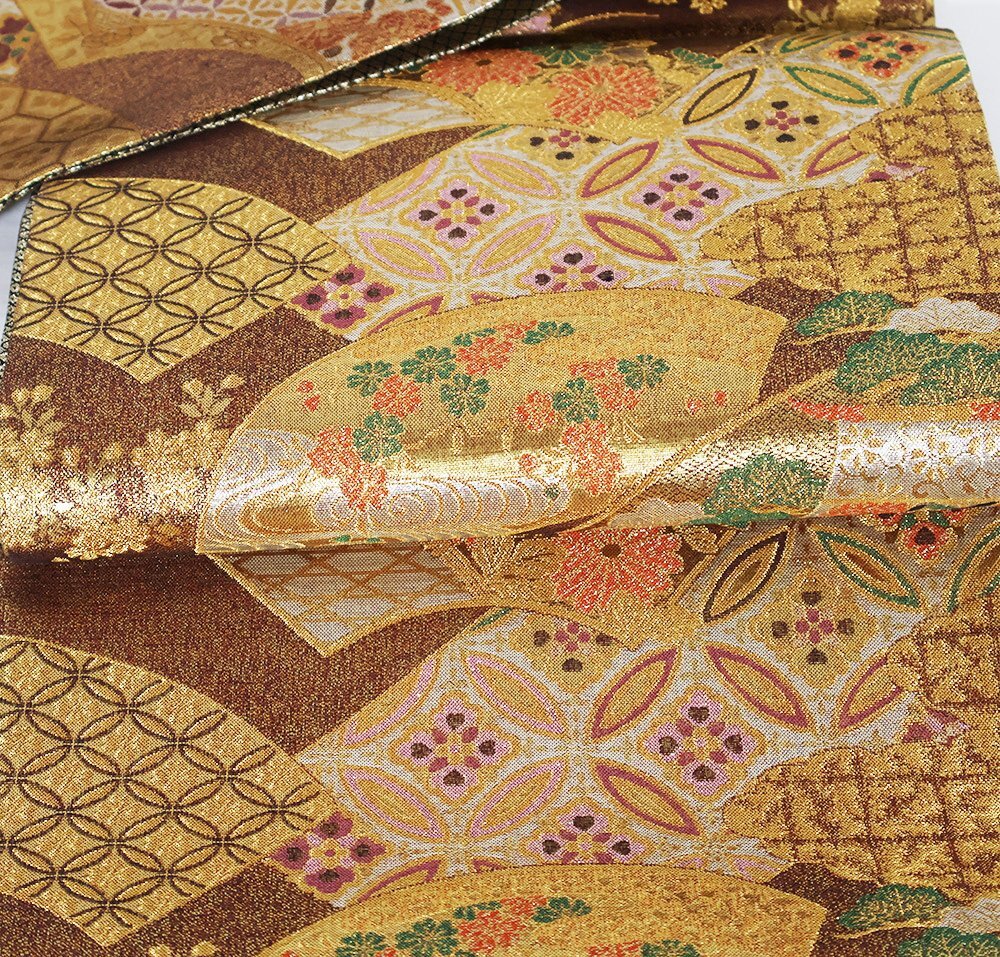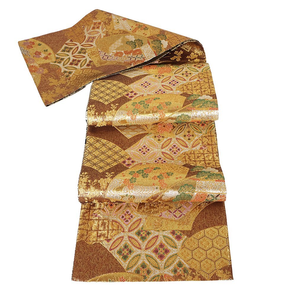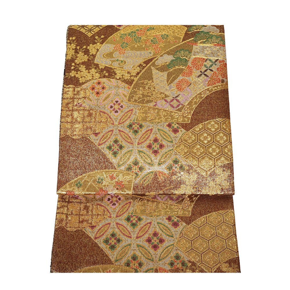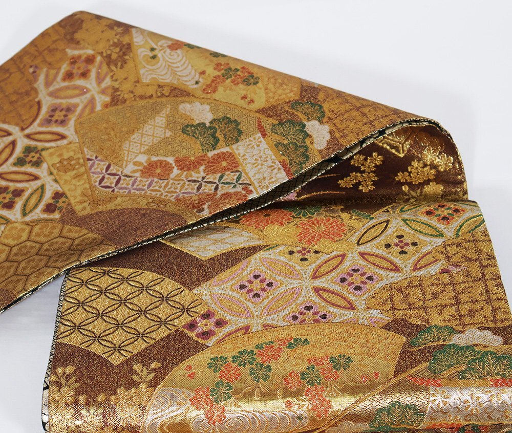 | 西陣織袋帯 両面帯 金・赤・緑地 地紙文 松竹梅・菊・七宝文 裏地:黒・金地辻が花 全通 未使用品 仕立て上がり |