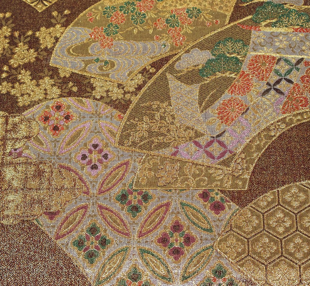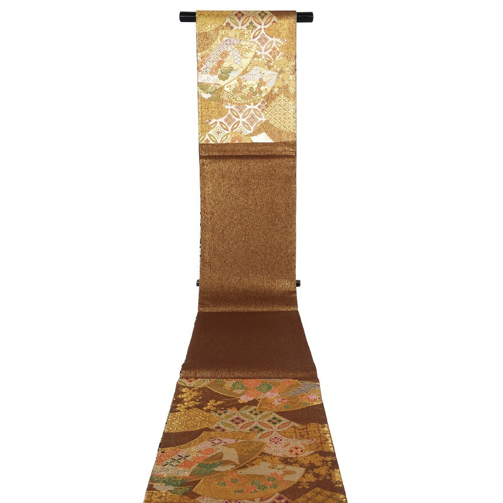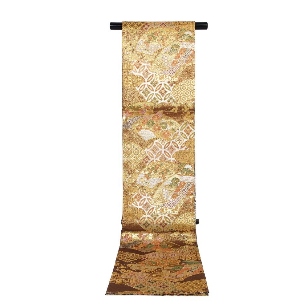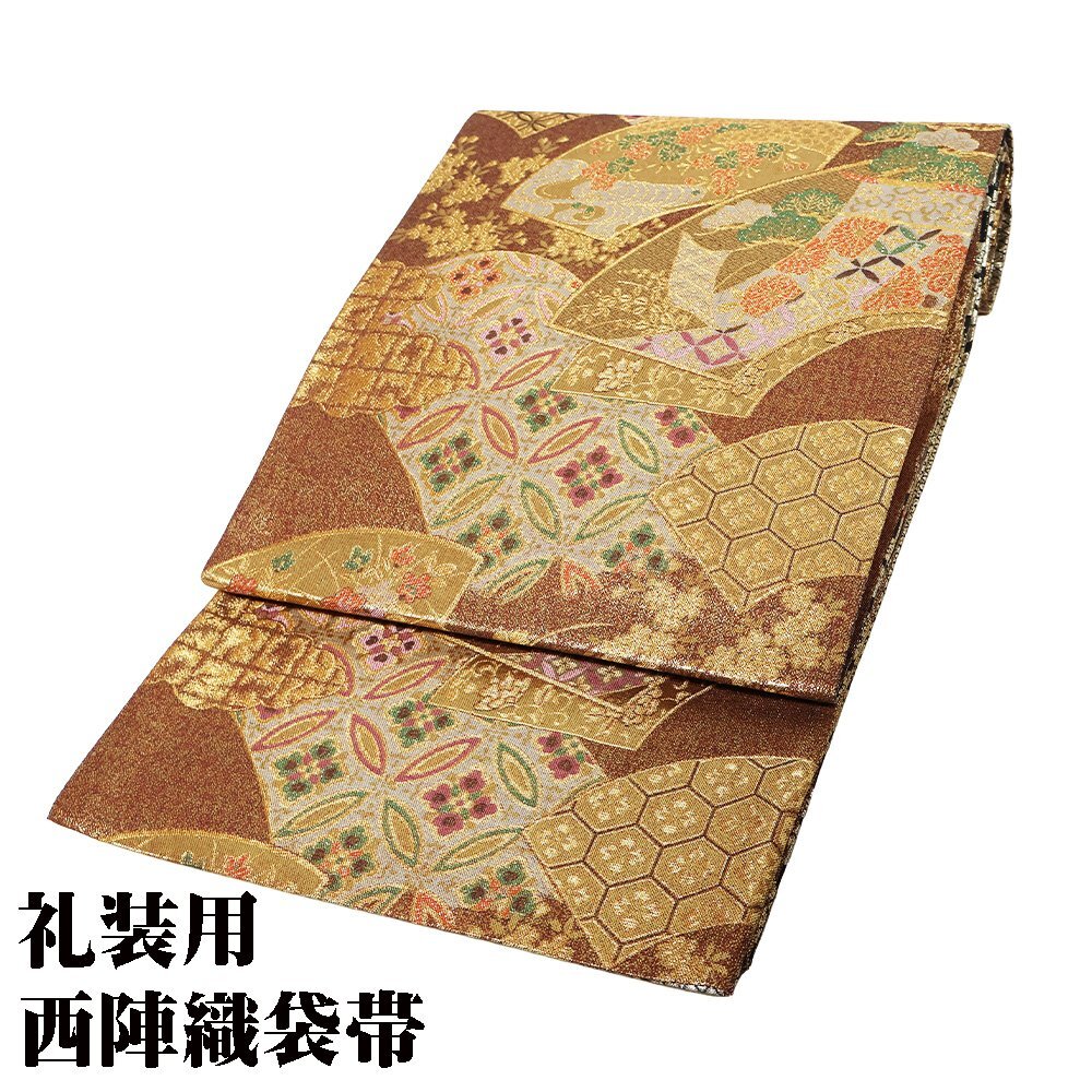 | 西陣織袋帯 両面帯 金・赤・緑地 地紙文 松竹梅・菊・七宝文 裏地:黒・金地辻が花 全通 未使用品 仕立て上がり |