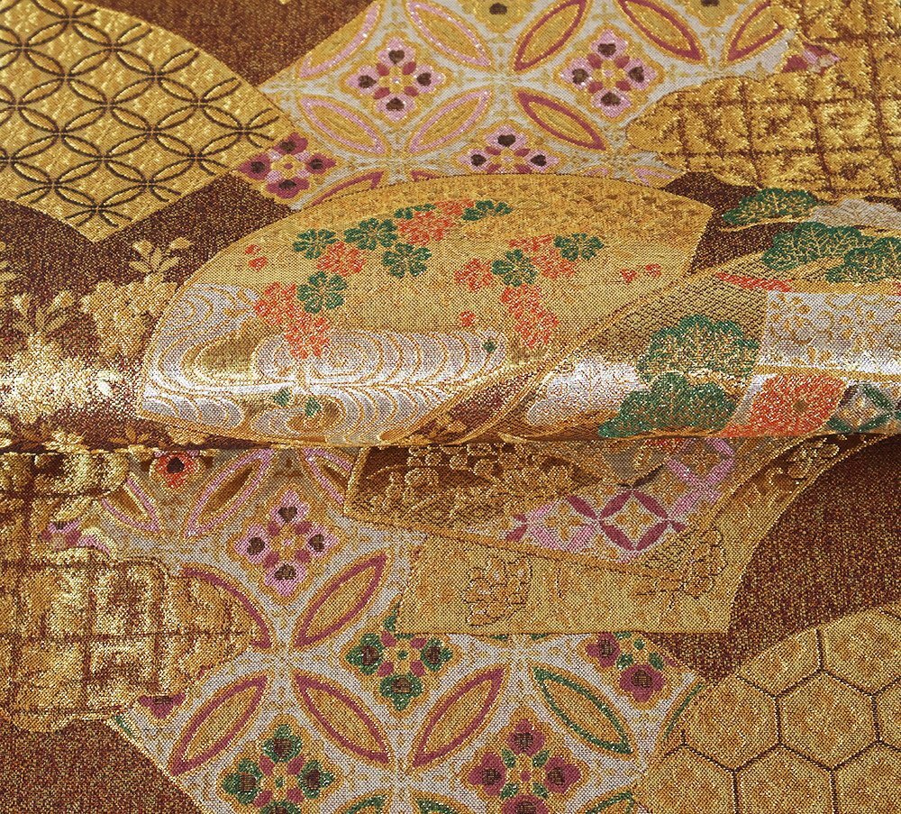西陣織袋帯 金・赤・緑地 地紙文 松竹梅・菊・七宝文 裏地:黒・金地辻が花 全通 (写真では上手く色が出ない場合があります。ご了承下さい) ※お使いのディスプレイの種類や設定の差により 実物の色と画像の色が少々異なることもございます。 写真の枚数が多いので一度パソコンでご覧ください。 |
