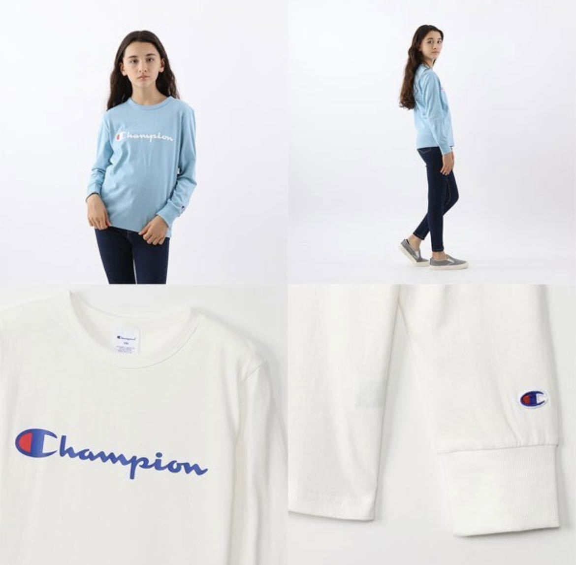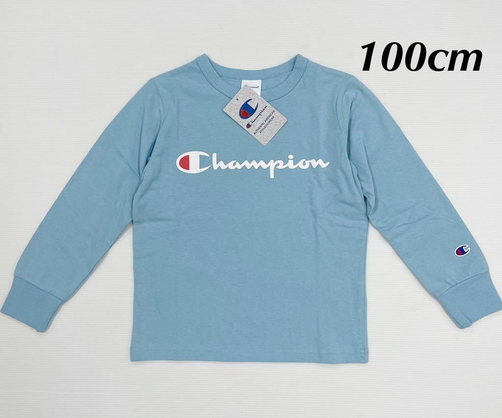 新品18621 Championチャンピオン100cm 水色ライトブルー長袖Tシャツ 胸プリントロゴ丸首Tシャツ  春オールシーズンキッズジュニア男女兼用