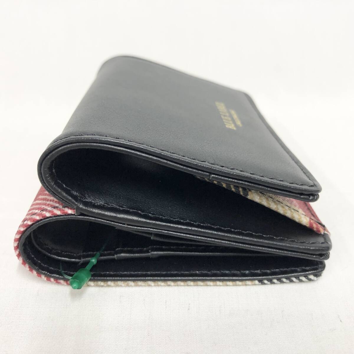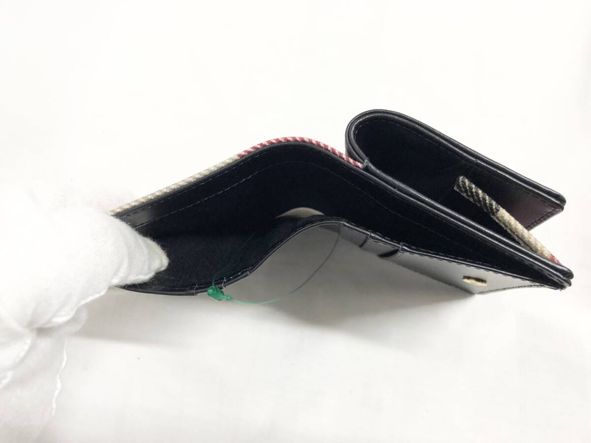 小銭入れ部分と札入れ部分がクレストブリッジチェックPVCの、二つ折り財布。ボックス型に開く小銭入れは、コインの出し入れがしやすいです。コンパクトですがお札もカードもしっかり入ります。