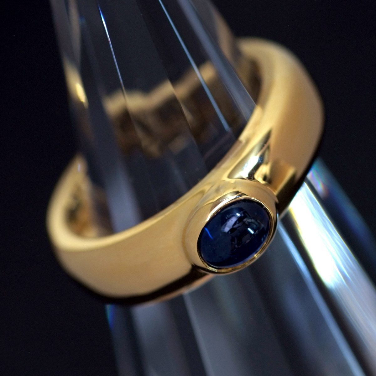 滑らかな光沢が美しいプレーンなイエローゴールド枠にカボションカットのブルーサファイアをセットしたショーメのリングでございます。優美なフォルムで品のある華やぎを演出してくれます。ノーブルジェムグレーディングラボラトリーの鑑別書付。
