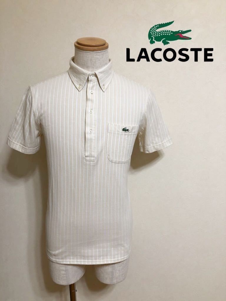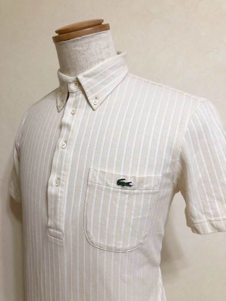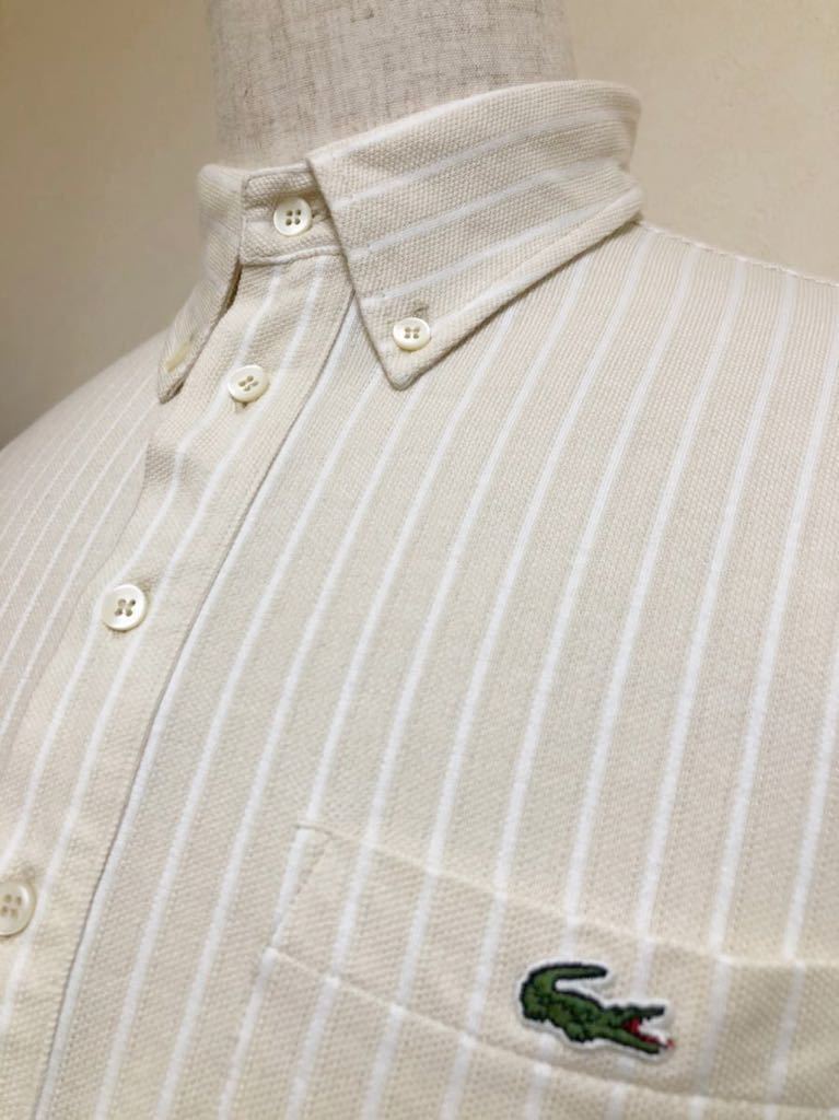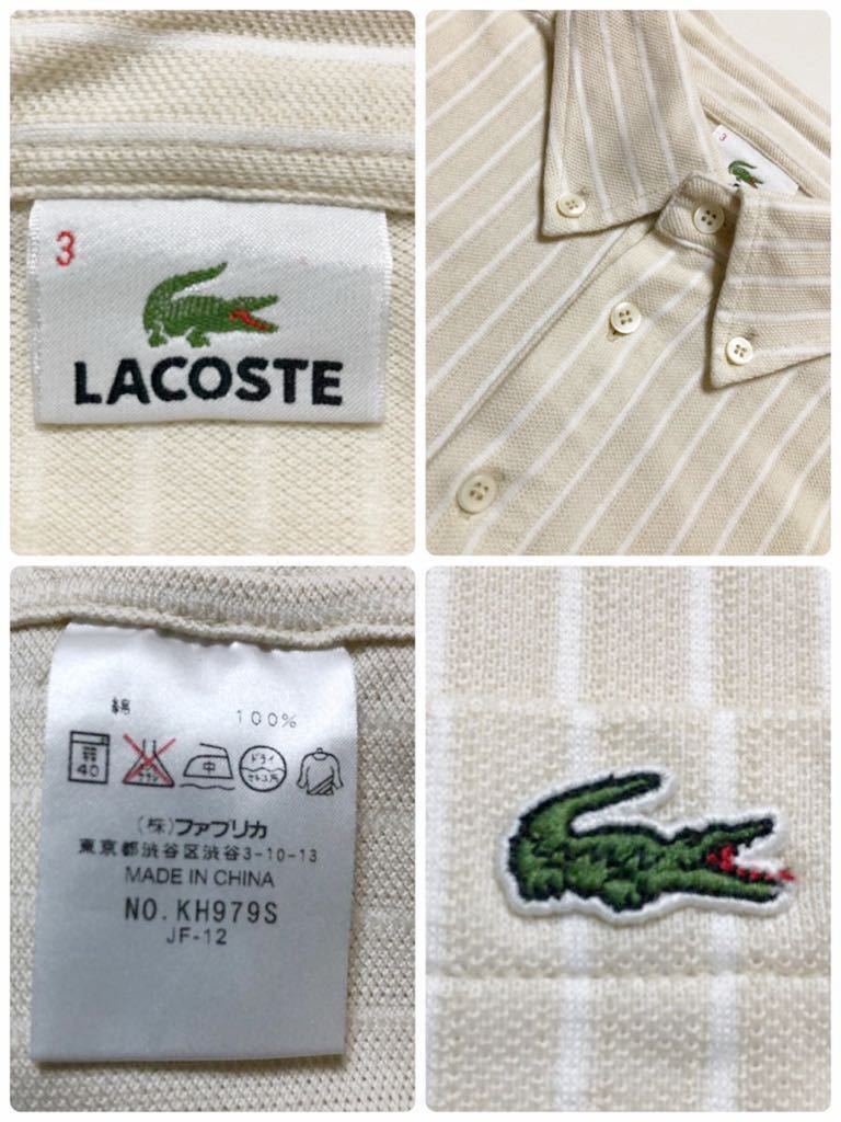 【美品】 LACOSTE ラコステ ボタンダウン 鹿の子 ポロシャツ ストライプ クリーム ホワイト トップス サイズ3 半袖 KH979S ファブリカ