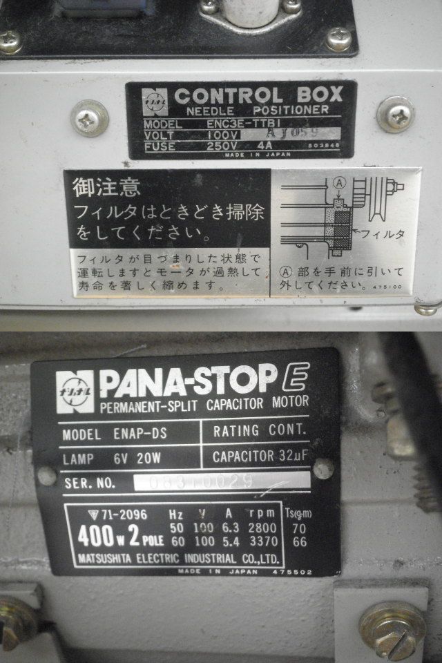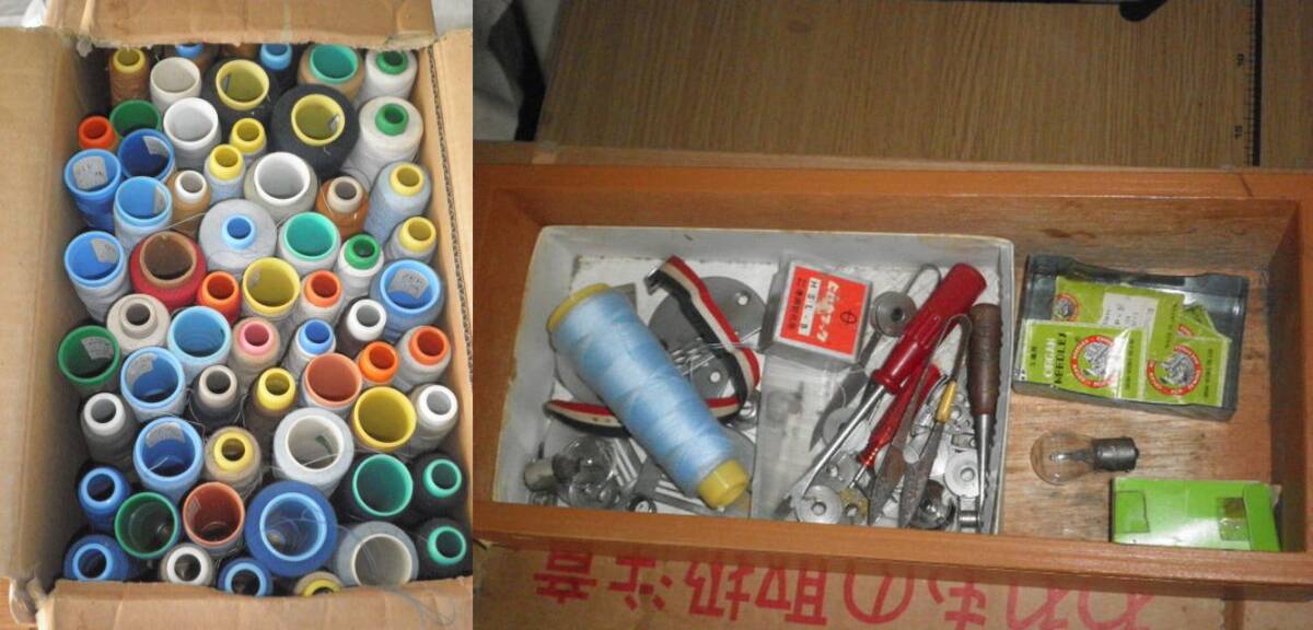 商品説明 | 代理出品に付質問等のお答えが遅くなる場合が有ります。 撮影時に実際使用して作動確認致しました。 但し、当方素人に付「電源をONにしてペダルを踏めば動く」程度の知識しかない為、作動確認も単純に雑巾を作っただけで全ての機能を確認した訳ではありません(ボビンの糸巻は出来ました)。 作動確認は動画に収めておりますのでそちらをご参照ください。 作動確認動画はコチラ。(動画が表示れない場合は下記URLをコピーしてアドレスバーに貼付けて下さい。)。 動画は下記URLです。 https://youtu.be/u39N7wwLEac 定格、能力等はコーションプレートの写真でご確認下さい。 付属品は写真の糸(70数本)と引き出しの中にある針、ボビン等の小物類で取説等はありません。 また、写真に写っているミシンを乗せている台車は付属いたしません。 傷、汚れ等ある現状渡しの中古品に付落札後はノークレーム・ノーリターンでお願いします。 基本的にお引き取り限定とさせて頂きますがをご希望が有れば西濃運輸にて発送いたします。 その場合は送料及び梱包費用をご負担願います。 |