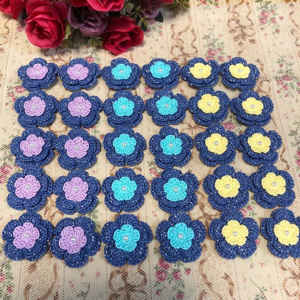 (パープル、パステルグリーン、パステルイエロー)×ラメ入りブルーのレース糸使用。