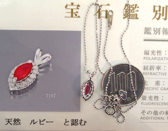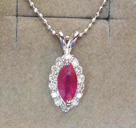 【総重量=2.5g(ペンダント0.9g+チェーン1.6g)・ペンダントの大きさ=(バチカンを含む縦巾16.02mm・最大横巾6.87mm・最大厚3.88mm)・ルビーの大きさ=(8.6×4.5mm)・バチカン穴サイズ=4.0×2.3mm・チェーン=Pt850製・カットボール・45cmフリーサイズ】*本物。鑑別書付き。