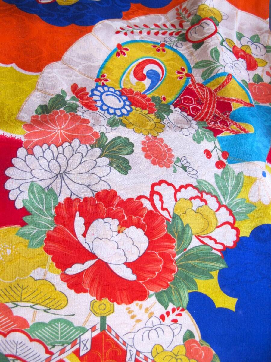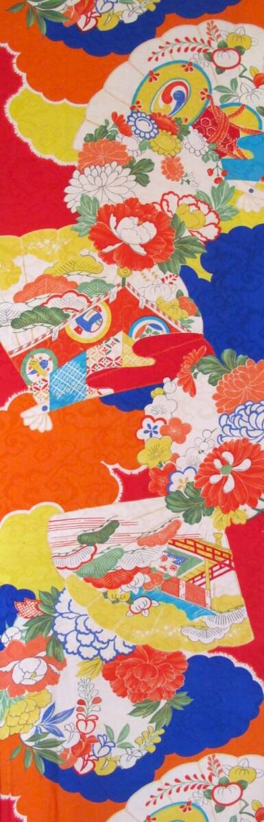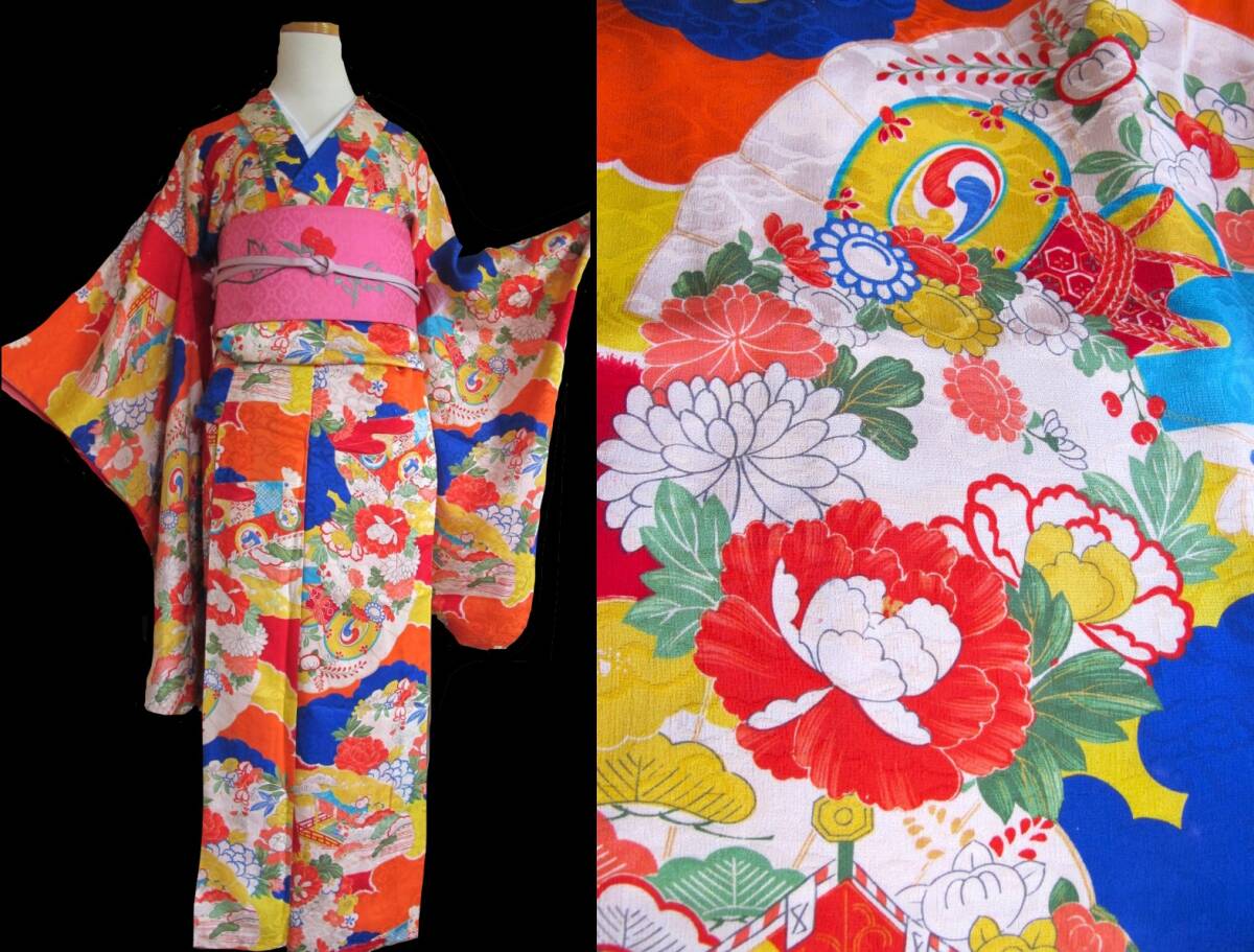 カラフルな雲どりに四季の花々の丸紋と檜扇が可愛いアンティーク着物です。 雲の地紋の紋錦紗地です。 鮮やかな染めに柄も細かな上質感のあるお品です。 |