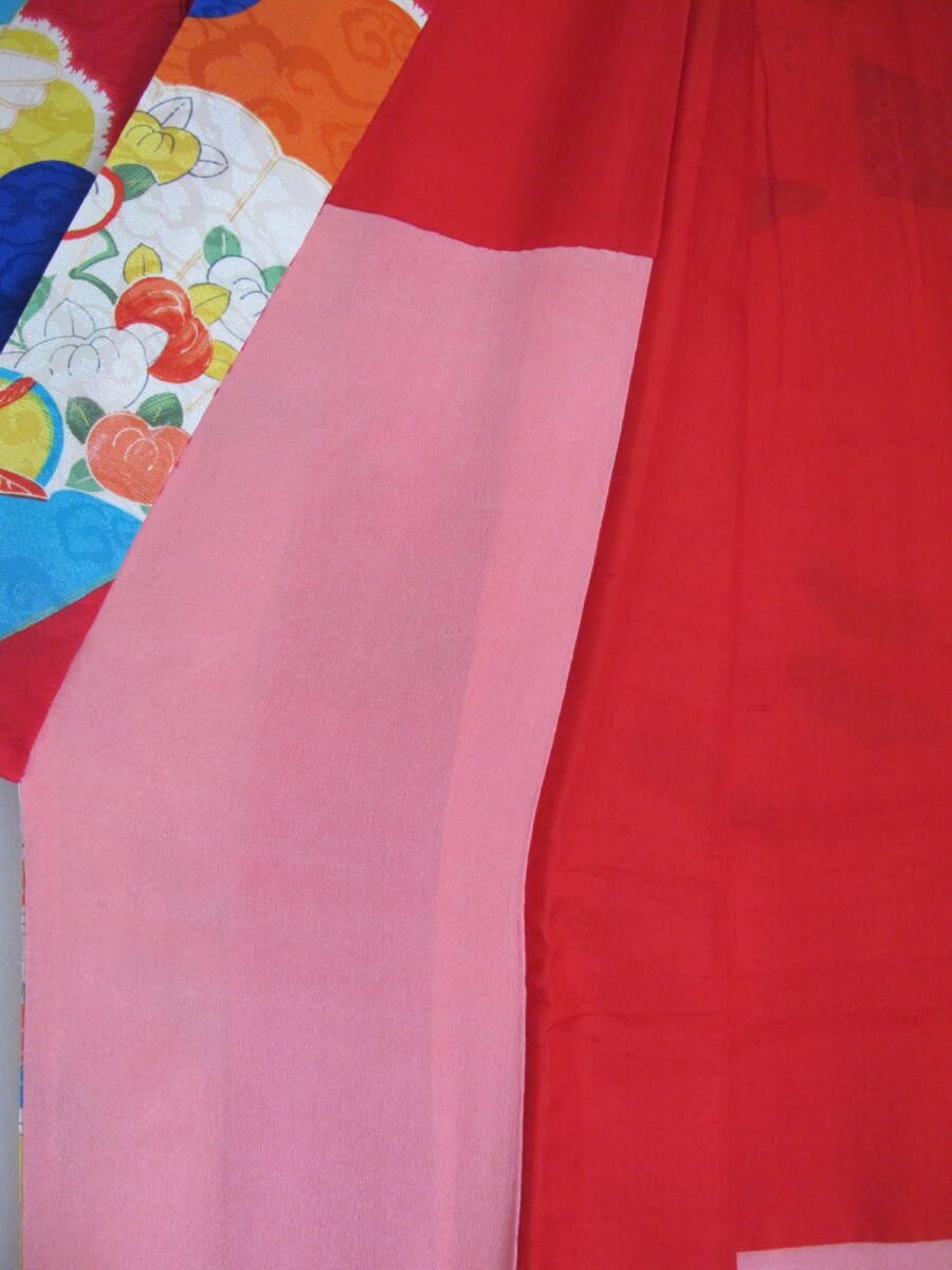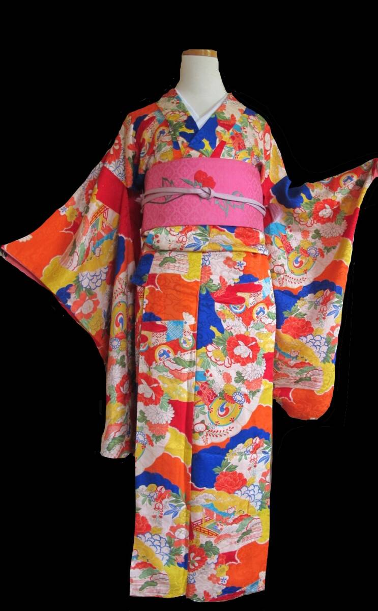 おおよその丈:身丈(肩)151.5cm、裄63cm、袖丈74cm、袖幅32cm、前幅22cm、後幅28.5cm 素材:正絹 |