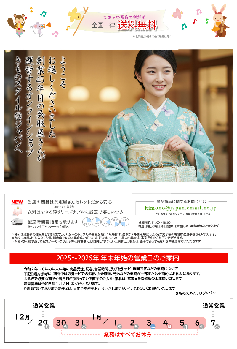 | 商品説明 | 2024年の新作ゆかた反物です。 素材:綿80%・麻20% ※通常の浴衣同様にご家庭でお洗濯頂けます。綿の浴衣は洗濯後に多少縮むため一度水通しをしてから仕立てをするか、少し身丈を長めに仕立てすることをお薦めします。 長さ:約12m、幅:約40cm 日本製 別途お仕立ても承ります。納期約1カ月。仕立て料金は11,000円(手縫いミシン併用仕立て) |