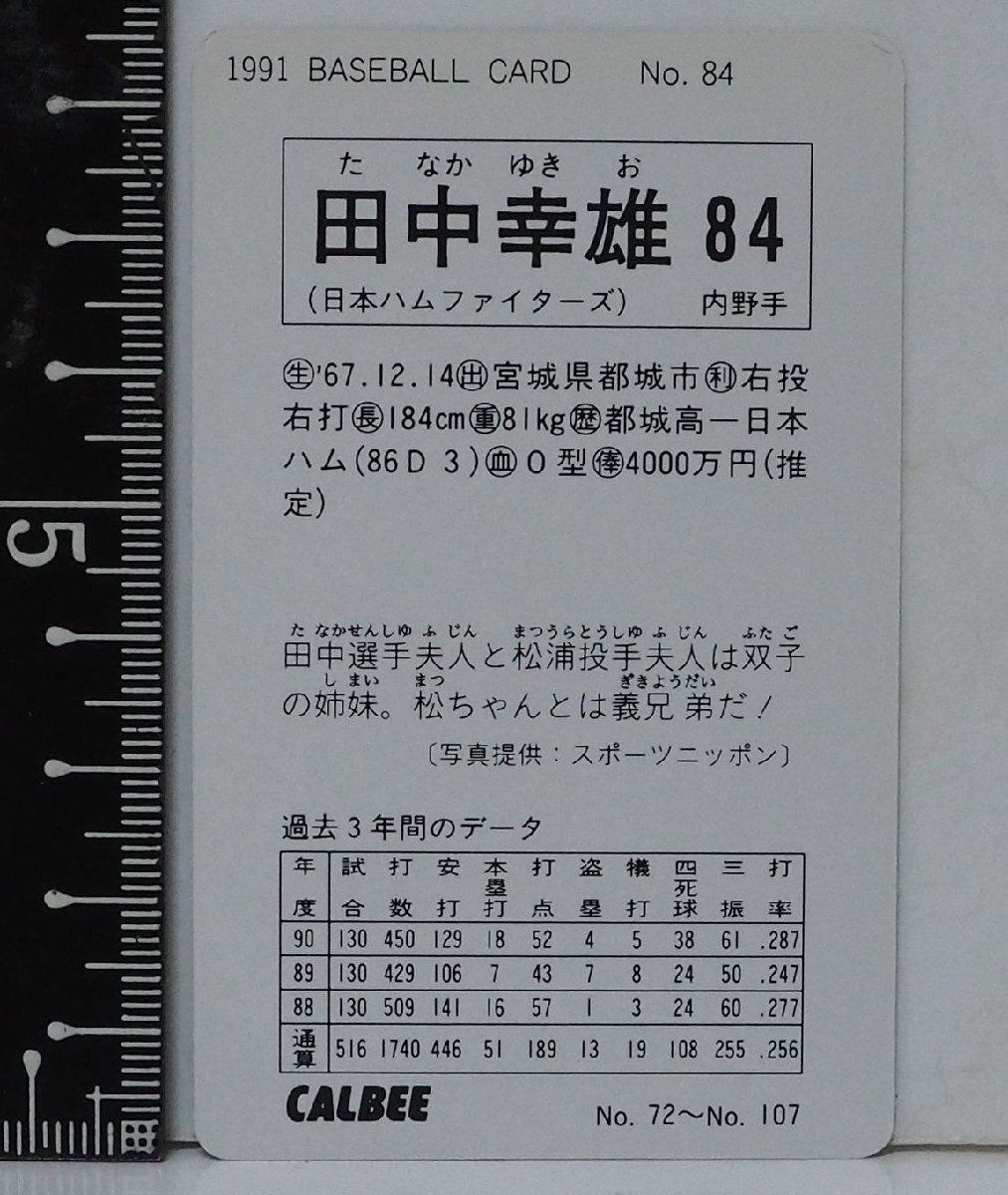 91年 カルビー プロ野球カード No.84【田中 幸雄 内野手 日本ハム ファイターズ】平成3年 1991年 当時物 Calbeeおまけ食玩BASEBALL【中古】