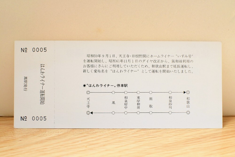 はんわライナー運転開始記念入場券(国鉄天王寺鉄道管理局)です。 阪和線にはんわライナーが運転開始された当時の貴重な記念切符です。 はんわライナーの運転開始前は、ホームライナーいずみという列車が運行されていました。 細かい点が気になる場合はご遠慮ください。ノークレーム・ノーリターンとさせていただきます。 【お願い】 ご購入の際は、写真・本文をよくご確認いただき、ご納得いただいた上でご購入ください。 落札者様のご確認が十分でなかったことが原因で 購入後にクレームされることの無いよう、よろしくお願いいたします。 |