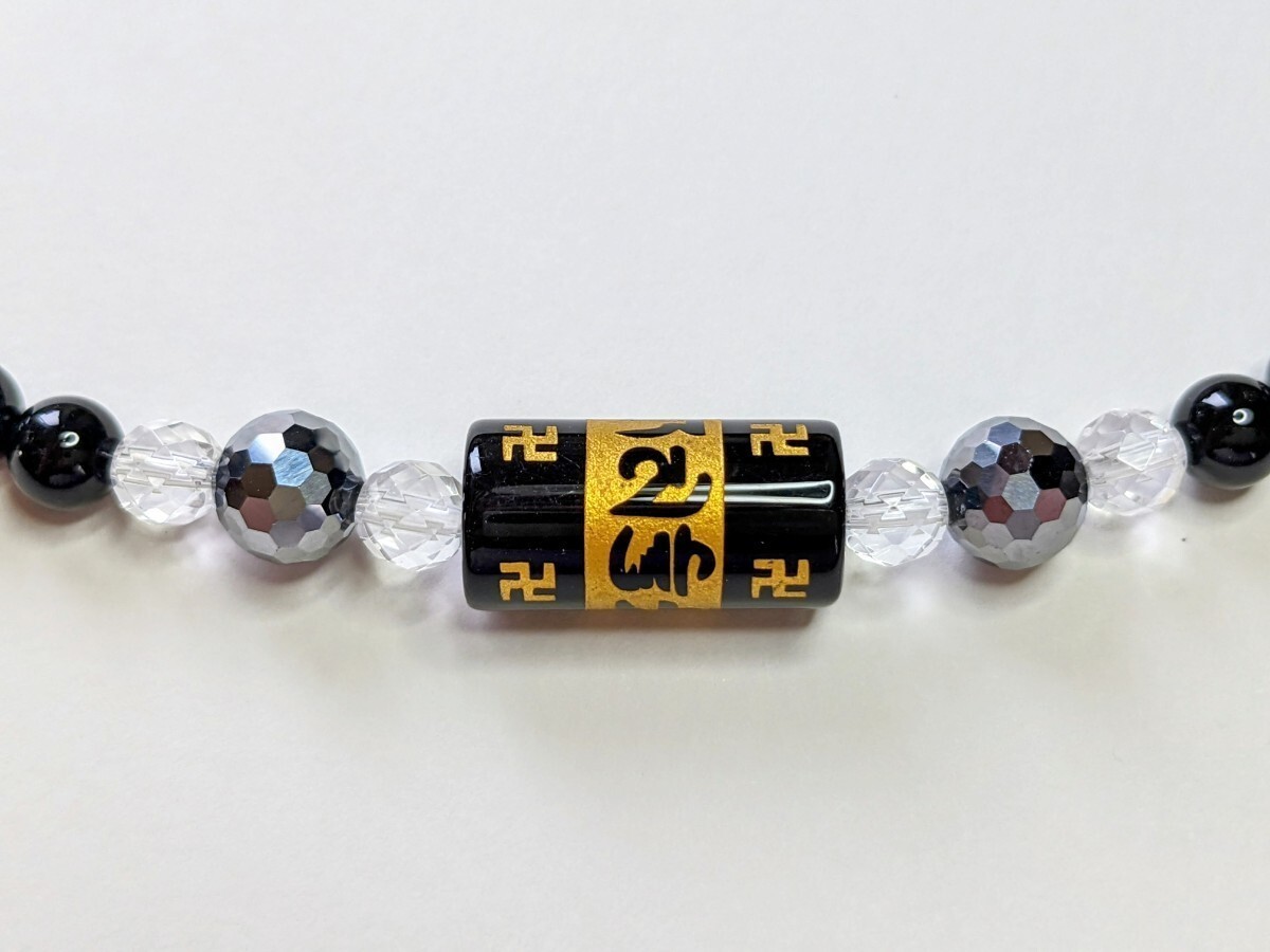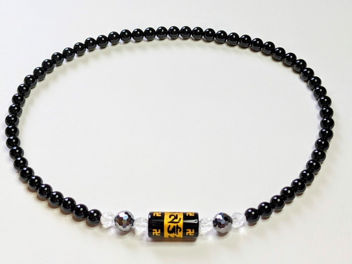 高純度テラヘルツを使ったネックレスです。 伸縮しますので、脱着が簡単です。 高純度テラヘルツ カット(珪素:99%以上) 約8mm×2個 キラキラ輝きます 天然ブラックオニキス(正式名:ブラックカルセドニー) 六字真言 彫刻 約20×10mm×1個 約6mm丸玉 天然水晶(正式名:ロッククリスタル) 約6mm カット 丸玉 ポリウレタンゴム使用 修理用に1回分お付けします。 長さ : 約40cm.45cm.50cm ご希望のサイズを取引メッセージでお知らせ下さい。 六字真言とは「オン・マ・ニ・パド・メ・フン」の6字からなっている、 観世音菩薩の慈悲を表現した真言であるため、観音六字とも呼ばれています。 チベットでは、観世音菩薩と観音六字が一体と考えられており、 それを唱えることで災いから護ってもらえると考えられています。 ブラックオニキスは、魔除け、厄除けとして、数珠に使われています。 水晶は、浄化作用があるといわれています。 テラヘルツ(珪素:99%以上) 名前の由来でもあるテラヘルツ波の周波数は、1兆Hzから100兆Hzの間にあり、その波長は3μm~1mm(1,000μm)の間にあります。テラヘルツ波は光と電波の両方の性質を持っており、直進性と透過性と浸透性を持っています。 テラヘルツ波は自然界のすべての物質や生命が自分自身で放射されていると言われています。 人間では、一番テラヘルツ波の量が多いのが、生まれたばかりの赤ちゃんで、加齢と共に減少していくそうです。また、病気の人よりも健康な人の方がテラヘルツ波の量が多いとも言われてます。 血行促進(凝り、冷え性などの改善)、免疫力・自然治癒力の向上、睡眠障害の改善、細胞の活性化、新陳代謝の向上に効果があると言われています。 同じタイプのブレスレットも出品しております。「出品者のその他のオークションを見る」からご覧下さい。 画像と実物との色合いが多少違う事があります。 画像はサンプルですが、同品質の商品をお送りします。 | |||