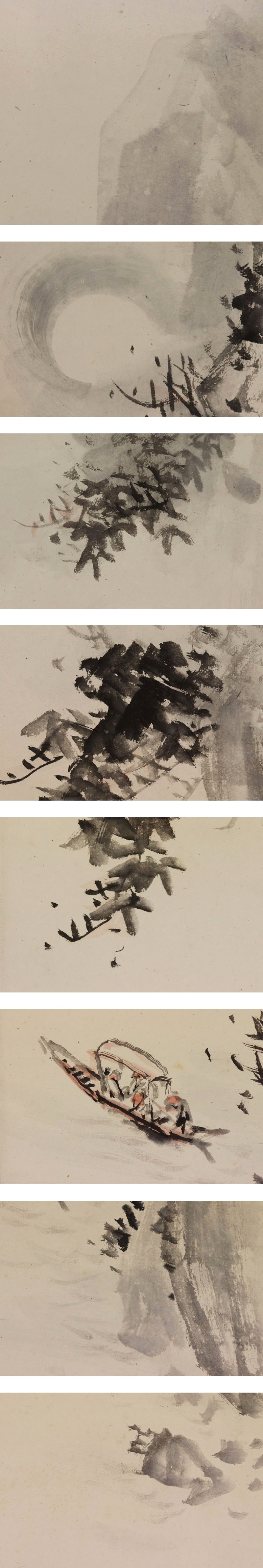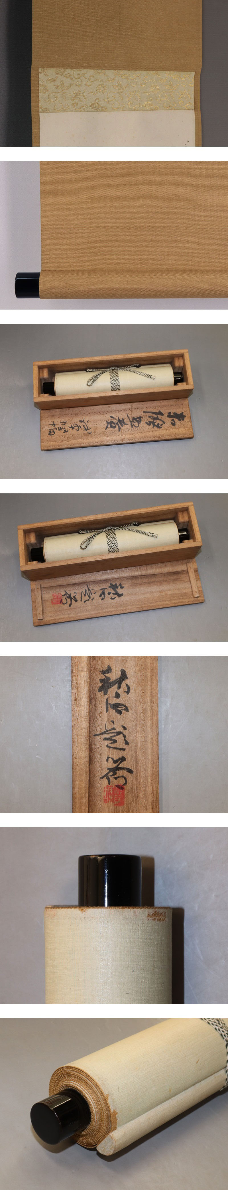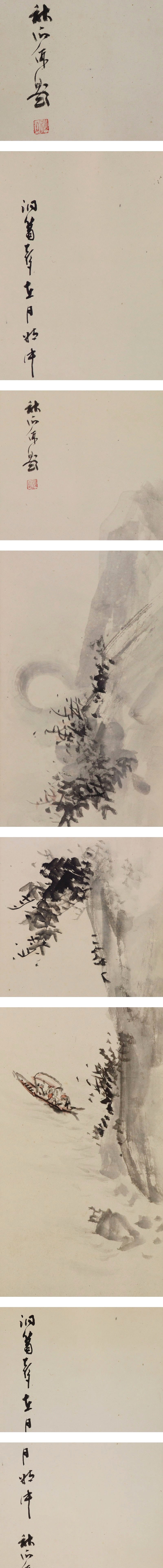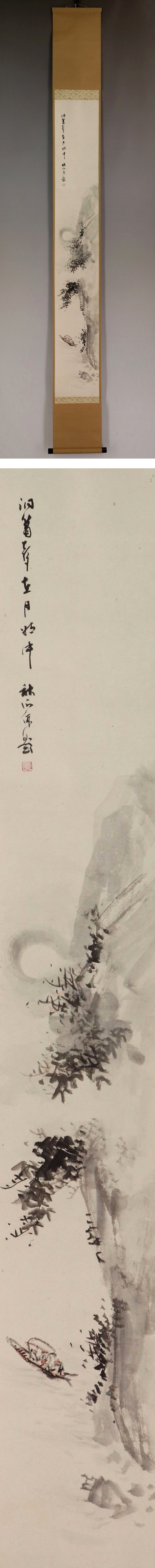 奥谷秋石 おくたに-しゅうせき(1871-1936) 日本画家。大阪生。名は常次郎。森寛斎に学ぶ。早くから橋本雅邦・川端玉章を主領とした。 青年絵画協会や日本絵画協会等に出品し受賞を重ねた。 また家塾を開いて門弟の養成に尽くし、明治・大正・昭和初期の京都画壇に重きをなした。 昭和11年(1936)歿、65才。 本紙は、染み、軽い折れ、皺があります。 表装は、染み、軽い折れ、皺、虫食、ほつれがあります。 【サイズ】 作品 横約19cm×縦約127.5cm 表装 横約21cm×縦約190cm |