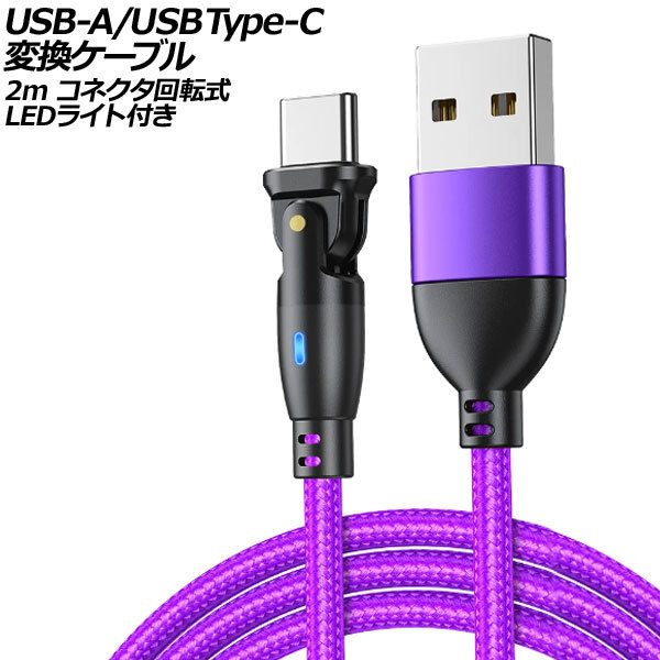 USB-A/USB Type-C 変換ケーブル パープル 2m コネクタ回転式 オス-オス LEDライト付き AP-UJ1023-PU-2M