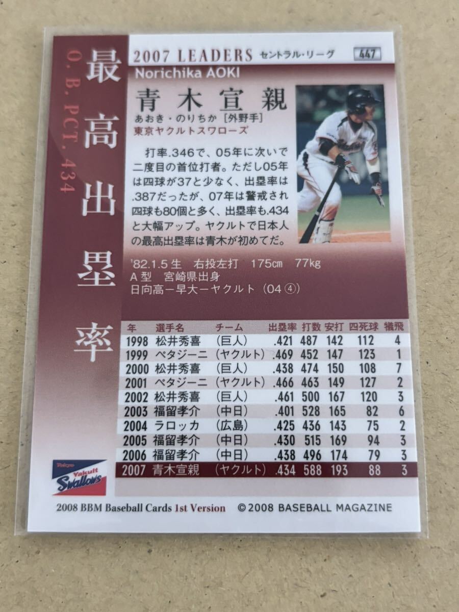 2008BBMベースボールカード1st 447 青木宣親 東京ヤクルトスワローズ 最高出塁率 セントラルリーグ