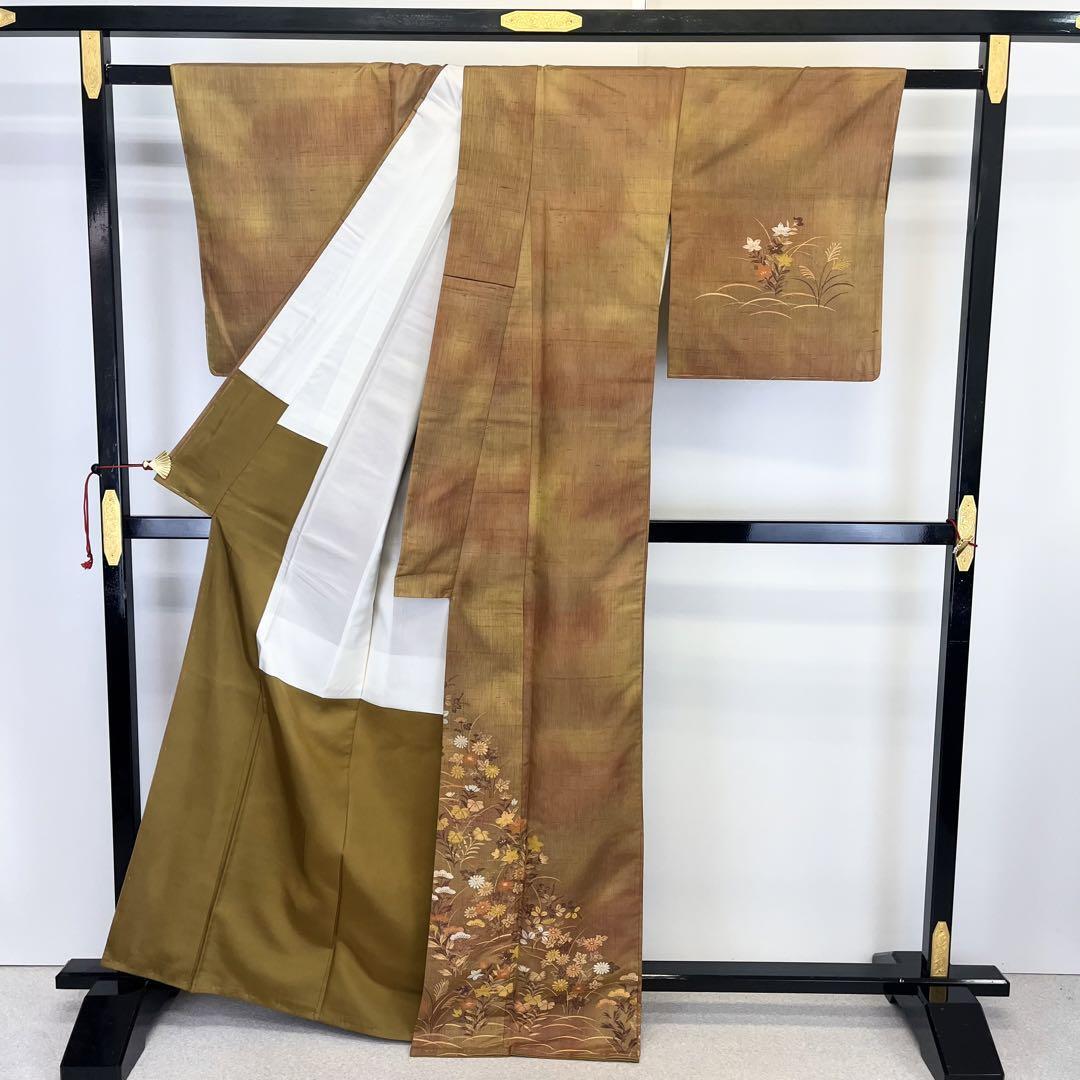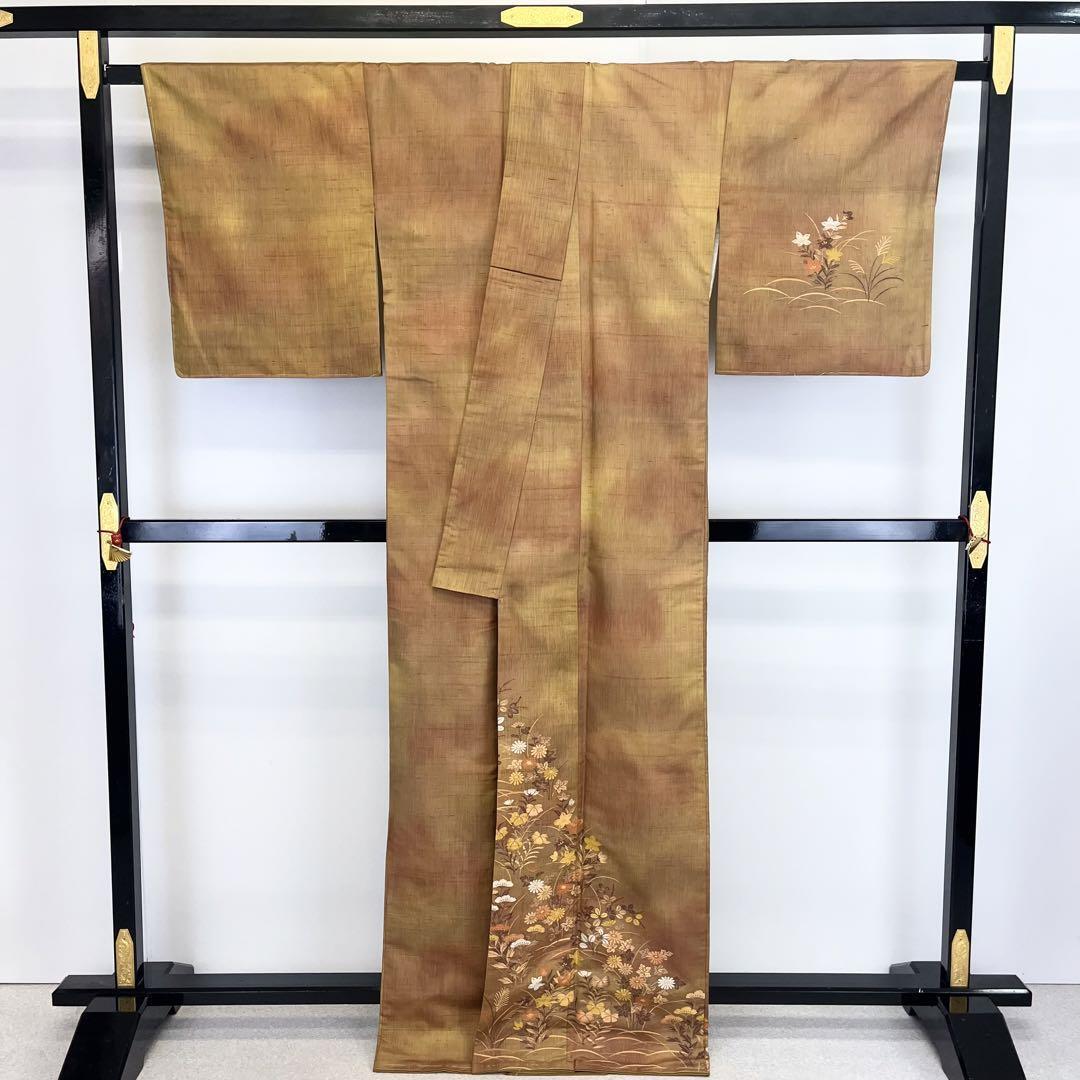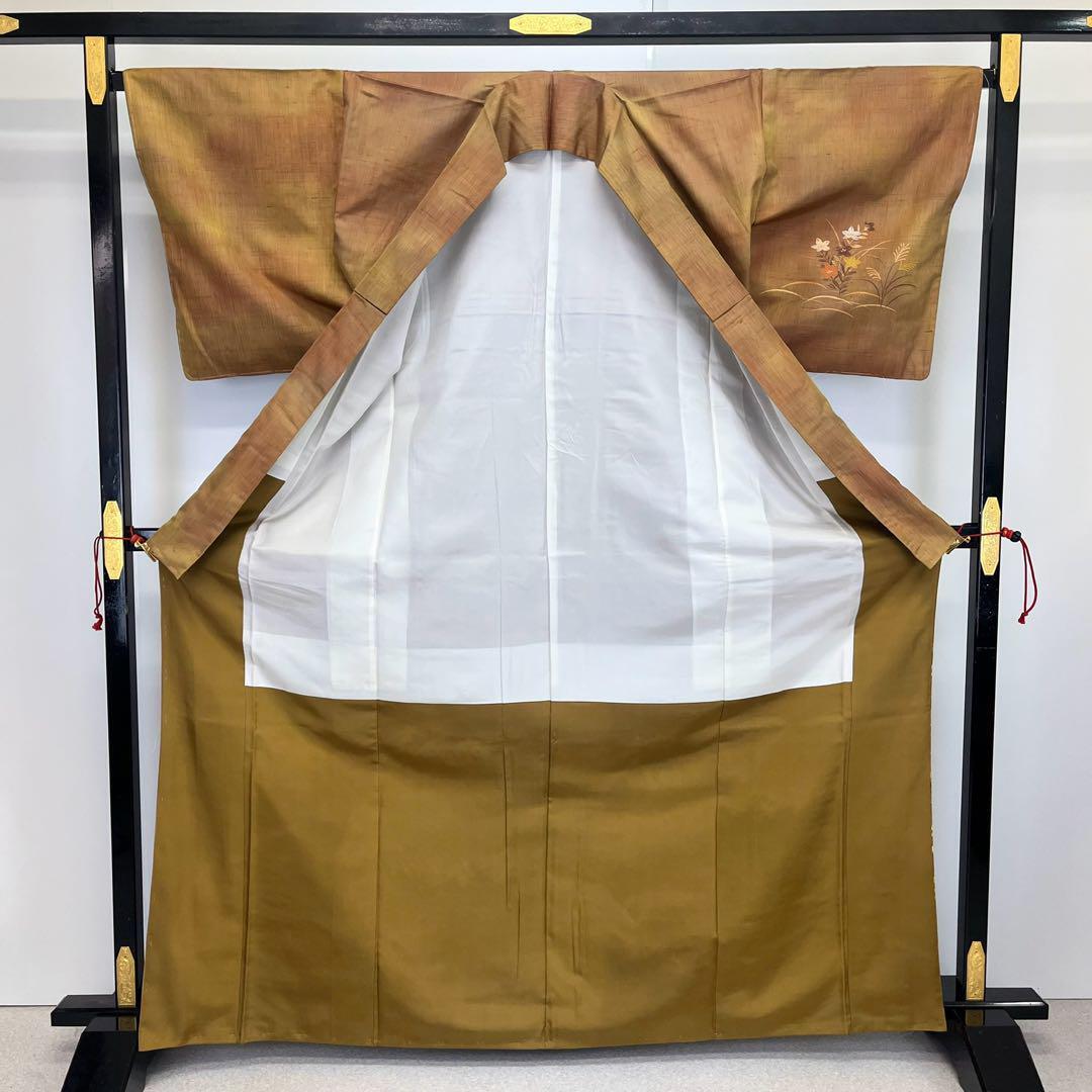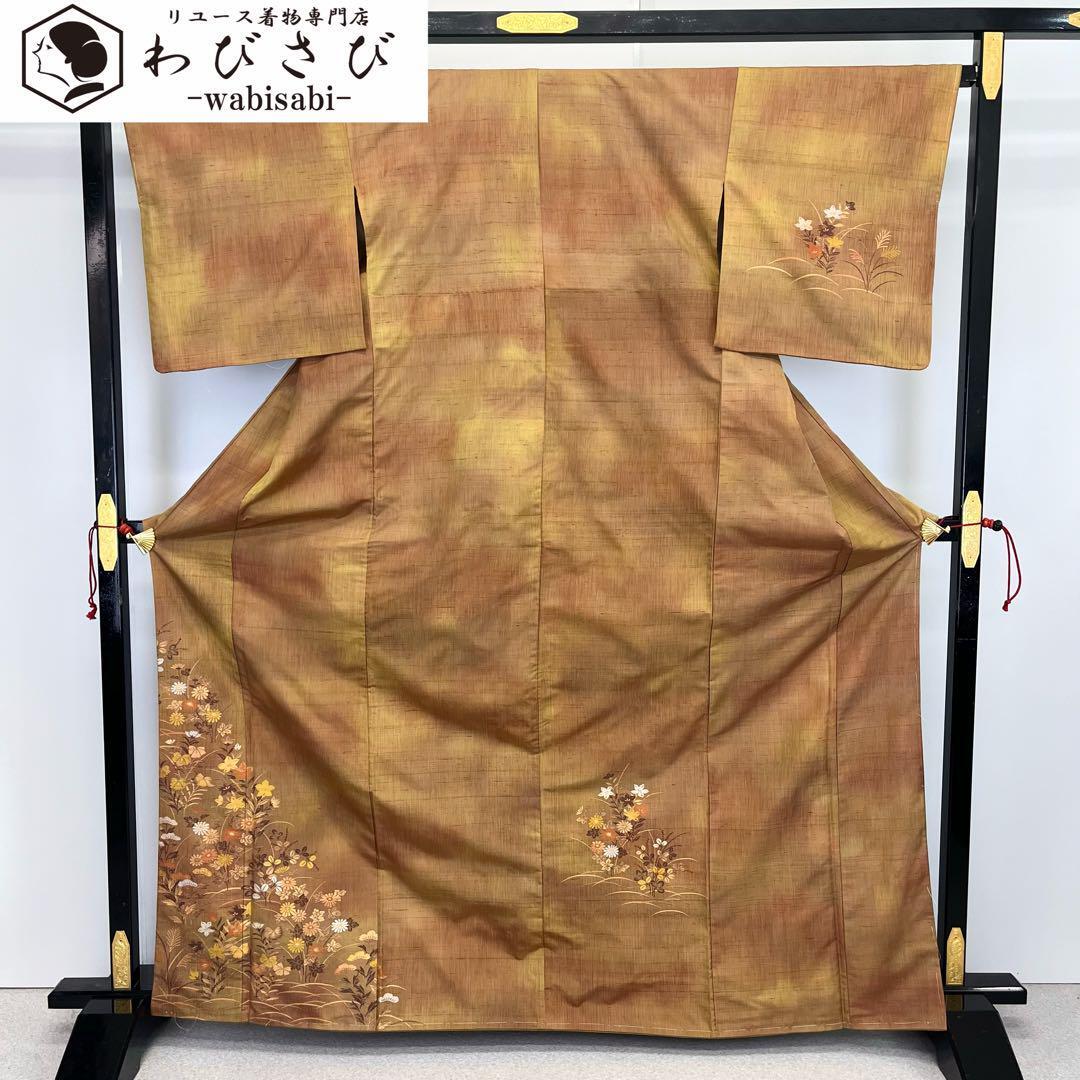 付下げ 紬 織の花模様 菊 萩 撫子 桔梗 松 暈し 肉柱色 K-3738