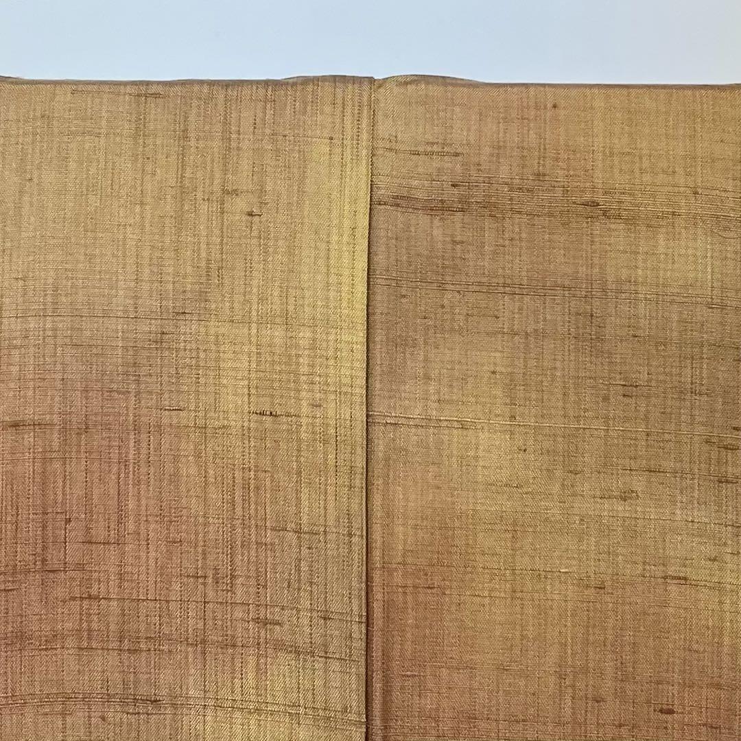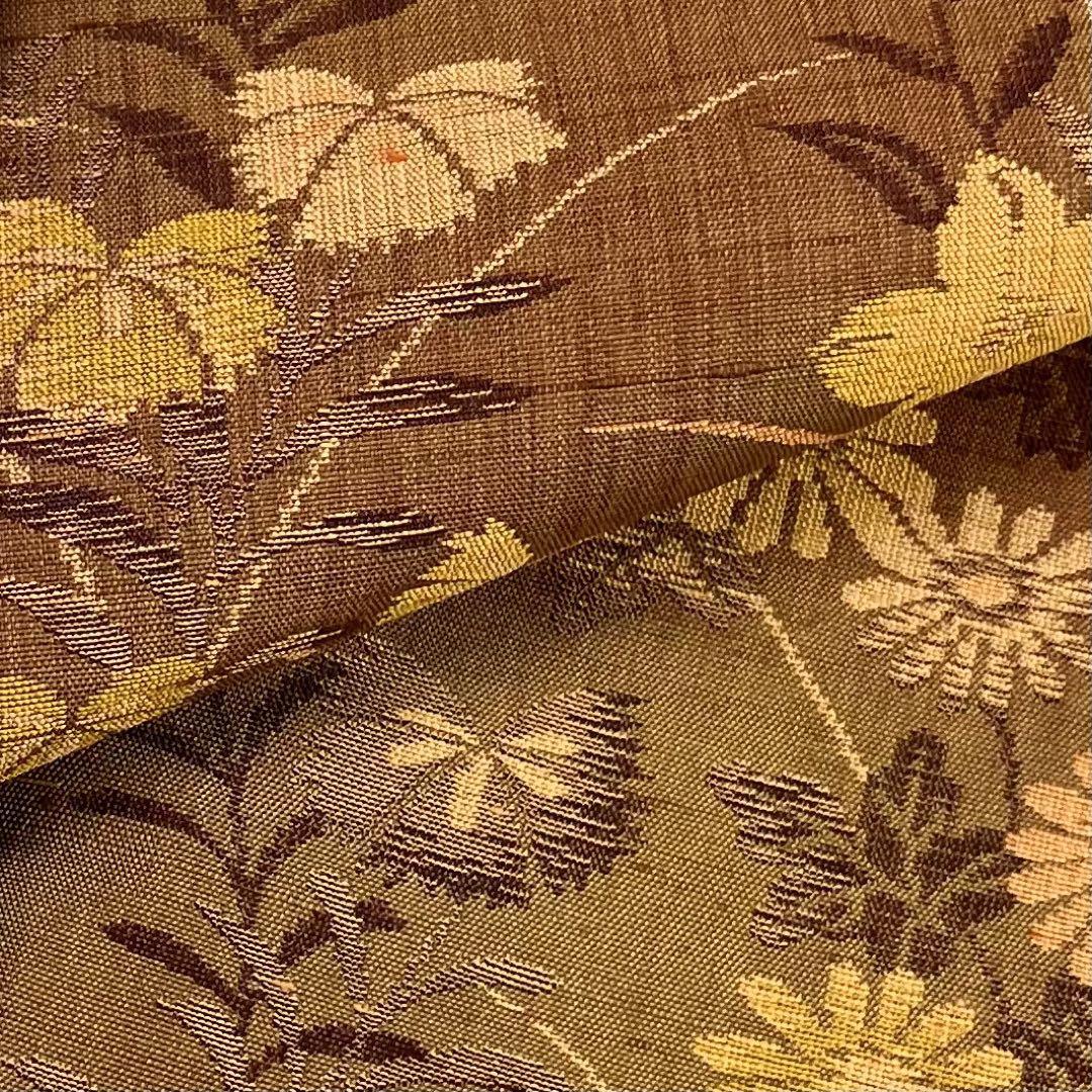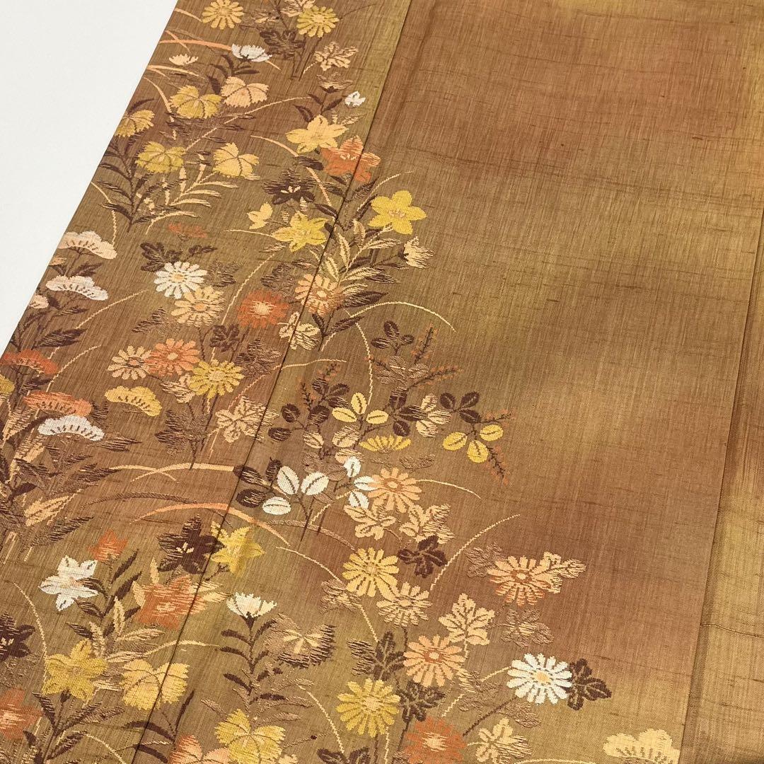 肉柱色ベースの暈しの紬地に菊、萩、撫子、桔梗、松などの織りの花模様がデザインされた雰囲気の良い素敵なお品でございます。