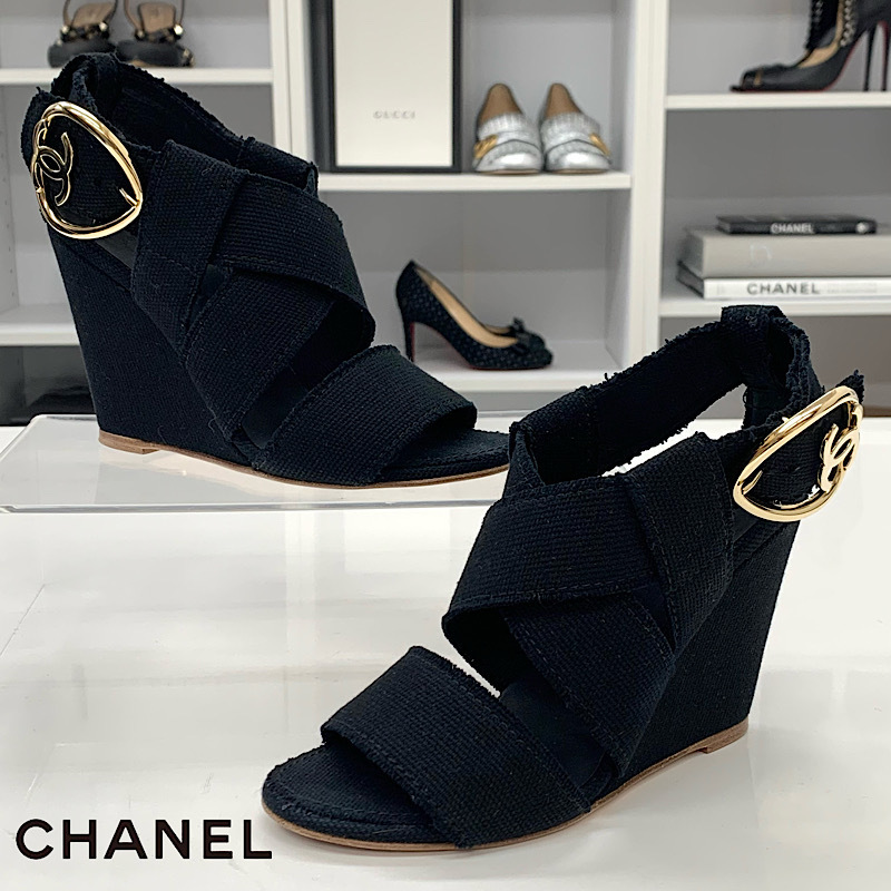 シャネル キャンバス ココマーク ウェッジソール サンダル ブラック