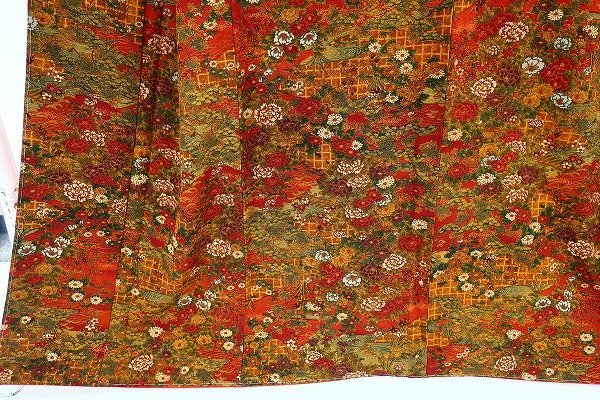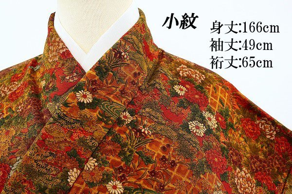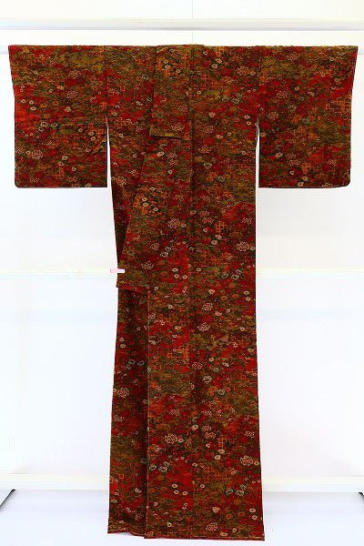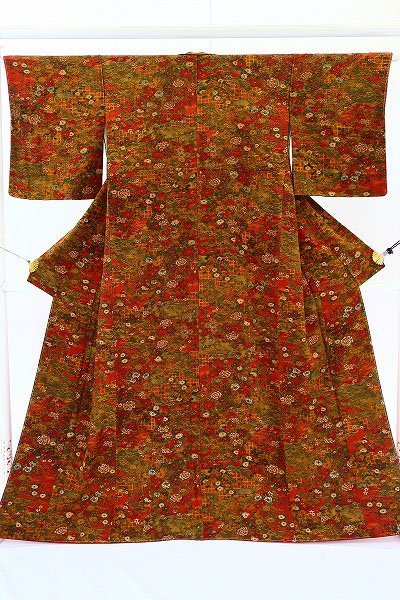 【着物フィ】未使用品 美品 小紋 赤茶色 秋 吉祥花 水流 トールサイズ 身丈166cm 裄丈65cm 袷 お洒落 仕立て上がり 正絹 袷 m-5117 |