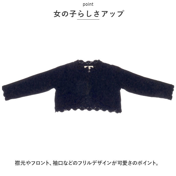 商品説明 | ・・女の子らしい繊細なデザインが魅力♪キッズ用のカーディガンが新登場。 ・【使い勝手の良いボレロデザイン】 ・上部のボタンを1つ留めるボレロタイプ。 ・【女の子らしさアップ】 ・襟元やフロント、袖口などのフリルデザインが可愛さのポイント。 ・【いつものコーデにプラス】 ・お手持ちのトップスやワンピースの上に羽織るだけ♪ ・【チクチク感がなく快適】 ・柔らかく優しいコットン素材を使用。 ・【1枚持っていると便利】 ・肌寒い日や日差しの強い日はもちろん、冷房対策にも。 ・【持ち運びもラクラク】 ・かさばらずコンパクトに折りたたみOK。カバンの中に忍ばせておけば、旅行時なども安心。 |