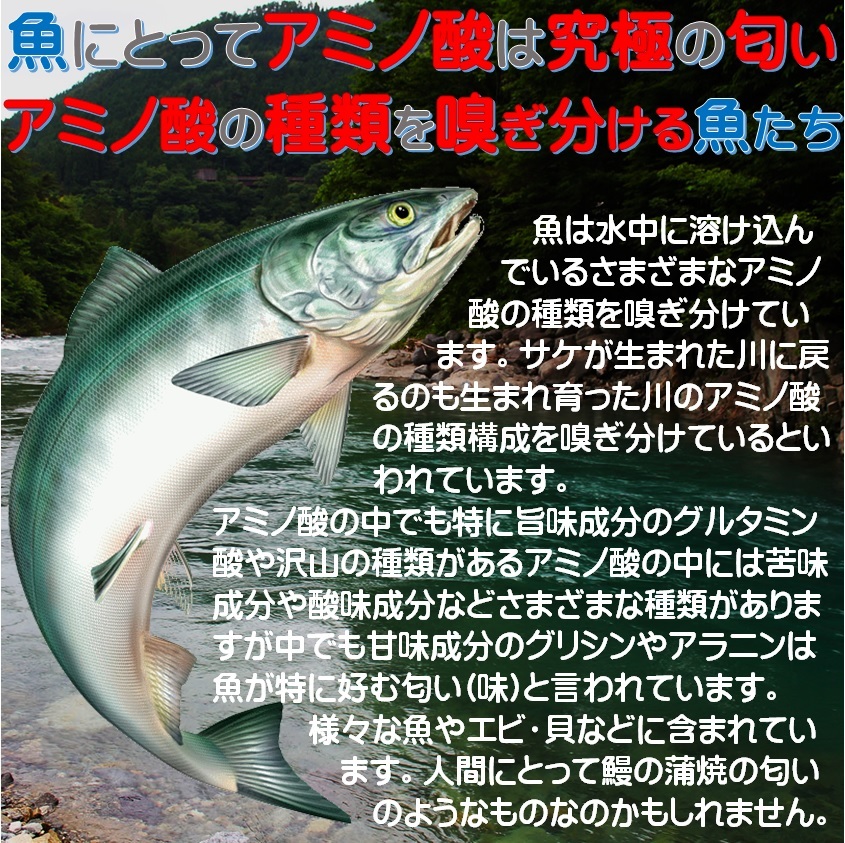 アミノ酸には沢山の種類がありますが旨味成分のグルタミン酸と甘味成分のアラニン・グリシンは魚たちの好むアミノ酸と言われています。そんな3種のアミノ酸を絶妙に配合。