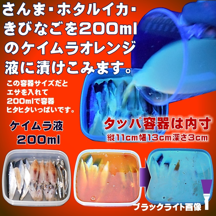 集魚剤 つけエサ用 アミノ酸配合 紫外線 蛍光発光 ケイムラ 加工液は、オキアミ イカ サバ サンマ イワシ ホタルイカ カツオ きびなご イソメ アサリのむき身などの つけエサに浸すことにより 紫外線加工 ケイムラ加工でき、水中で つけエサを 紫外線発光させるための液体です。