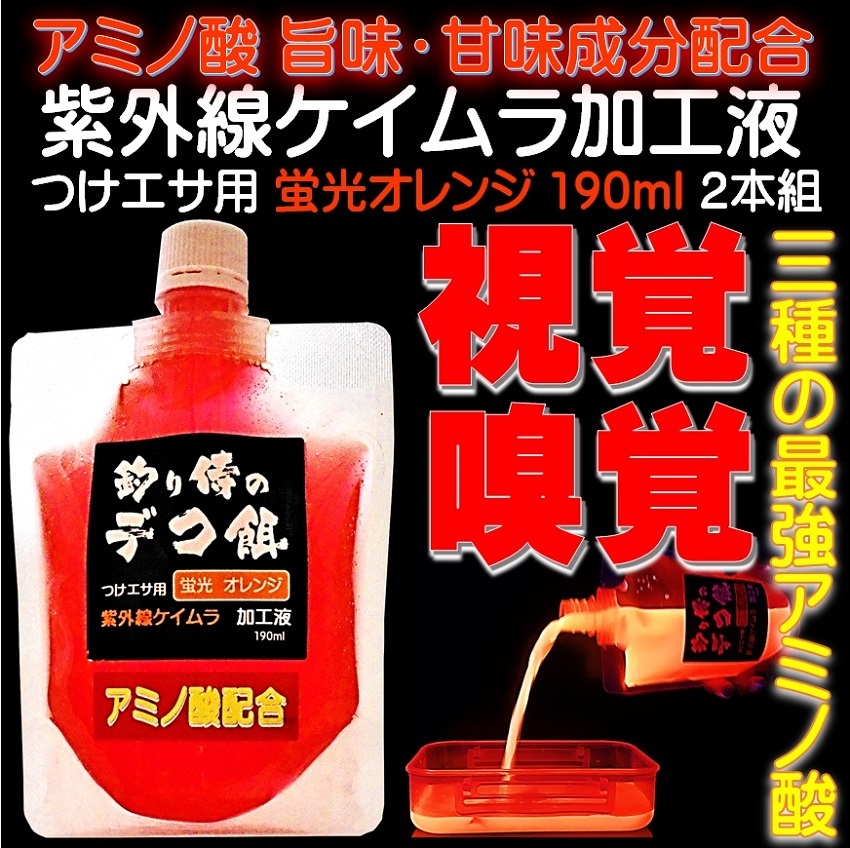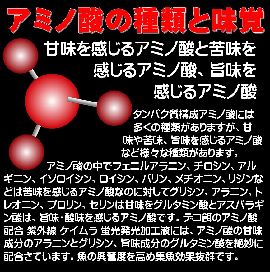 つけエサ用 3種のアミノ酸配合 つけエサ用 紫外線 蛍光発光 ケイムラ加工液は魚の視覚と嗅覚(味覚)をダブルで刺激して魚を誘います。