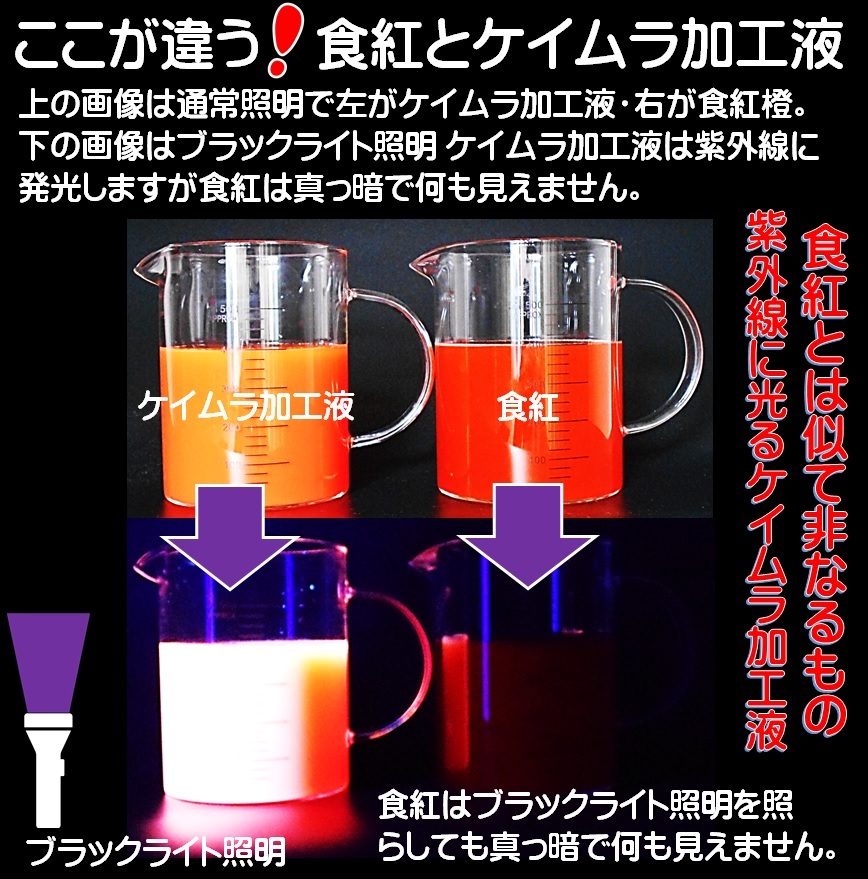 ※注 食紅とは全く違います。食紅は紫外線に発光しません。