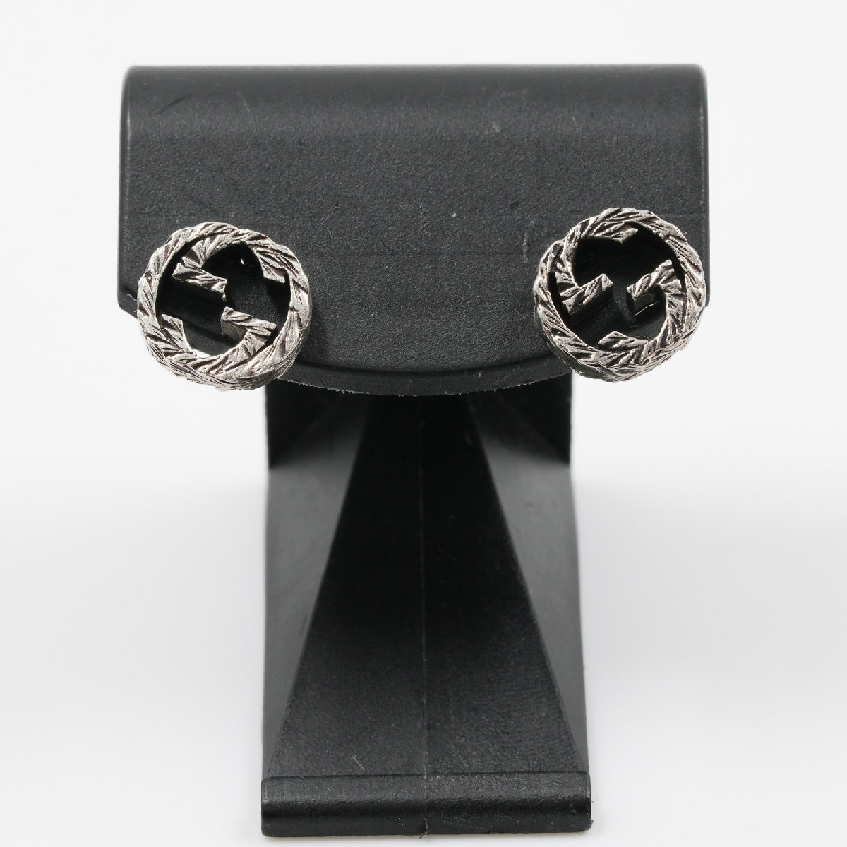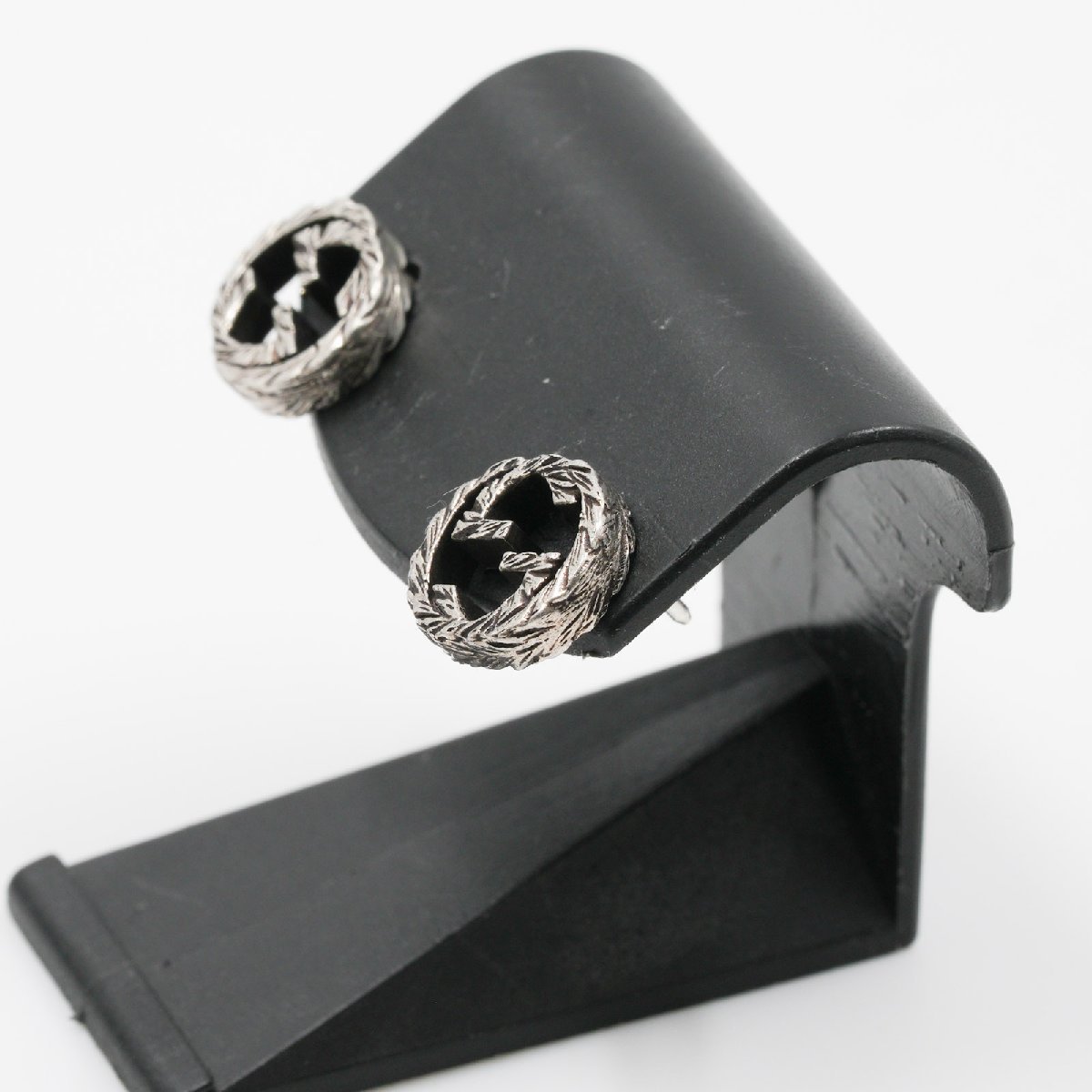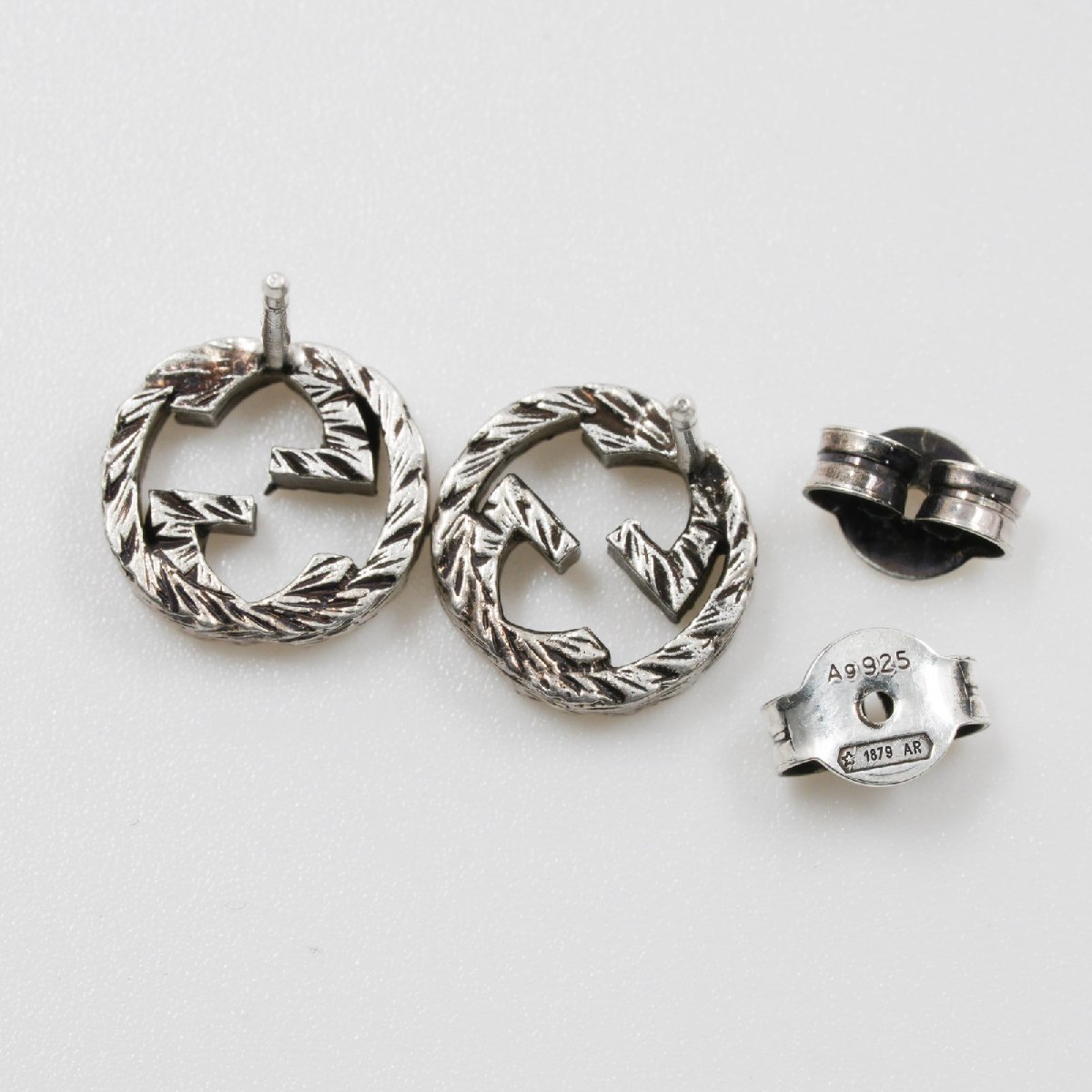 ヴィンテージ風のアラベスク彫刻が施されたピアスです。元々黒ずみがあるお品物ですので、あえて超音波洗浄機によるクリーニングのみ行っています。