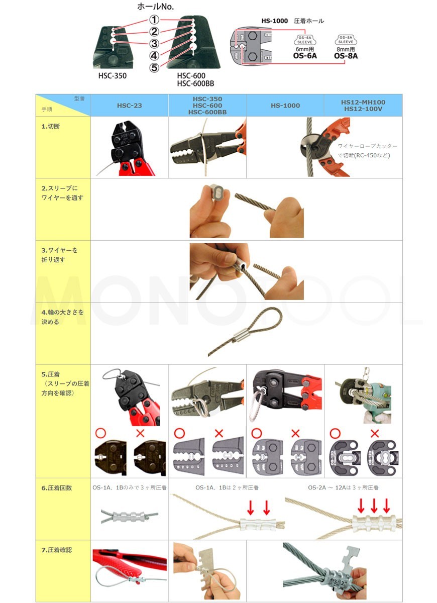 他社製圧着工具、またはスリーブは絶対使用しないでください。荷重に耐えられず事故の恐れがあります。