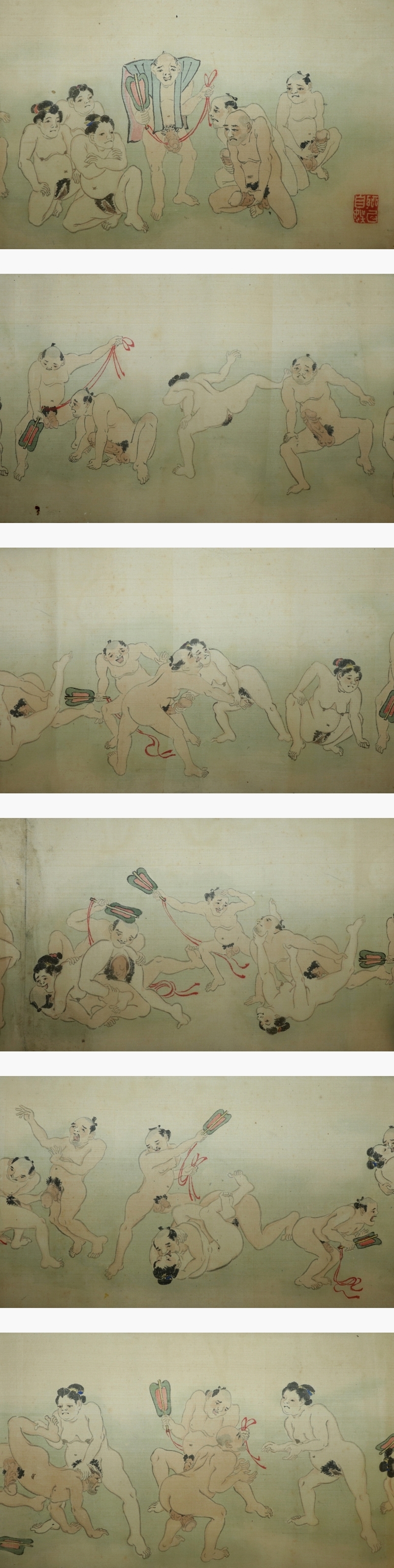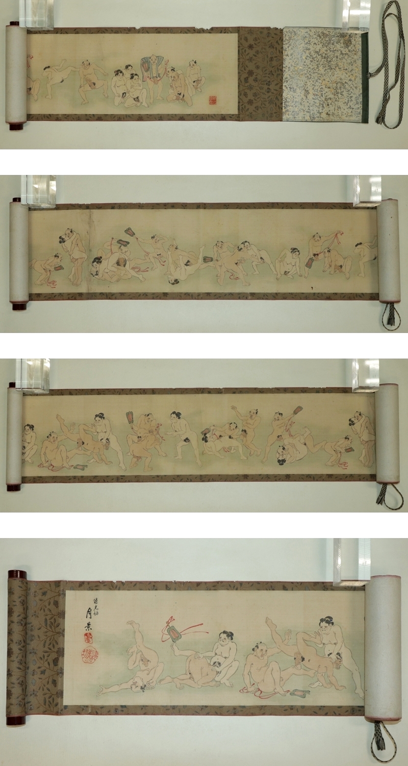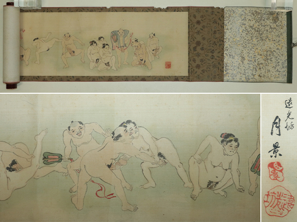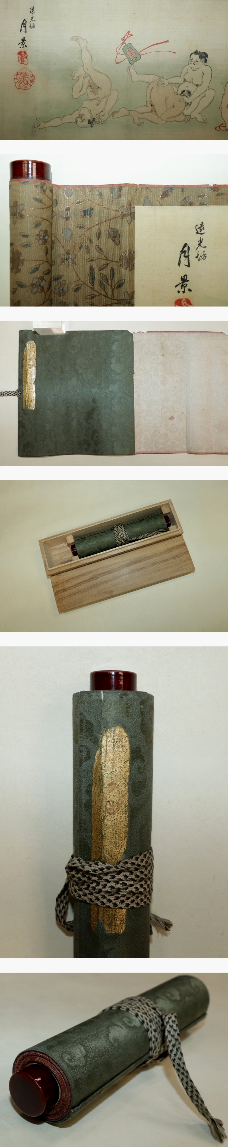 | №2111248 珍品【肉筆】鳥羽絵【相撲図】◆絹本◆合箱◆巻物 | |
