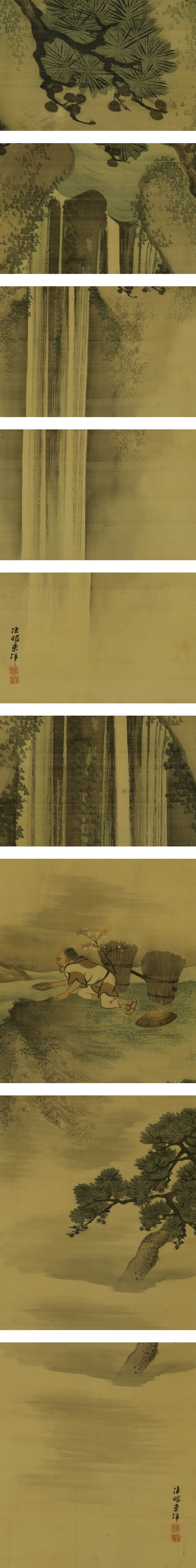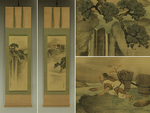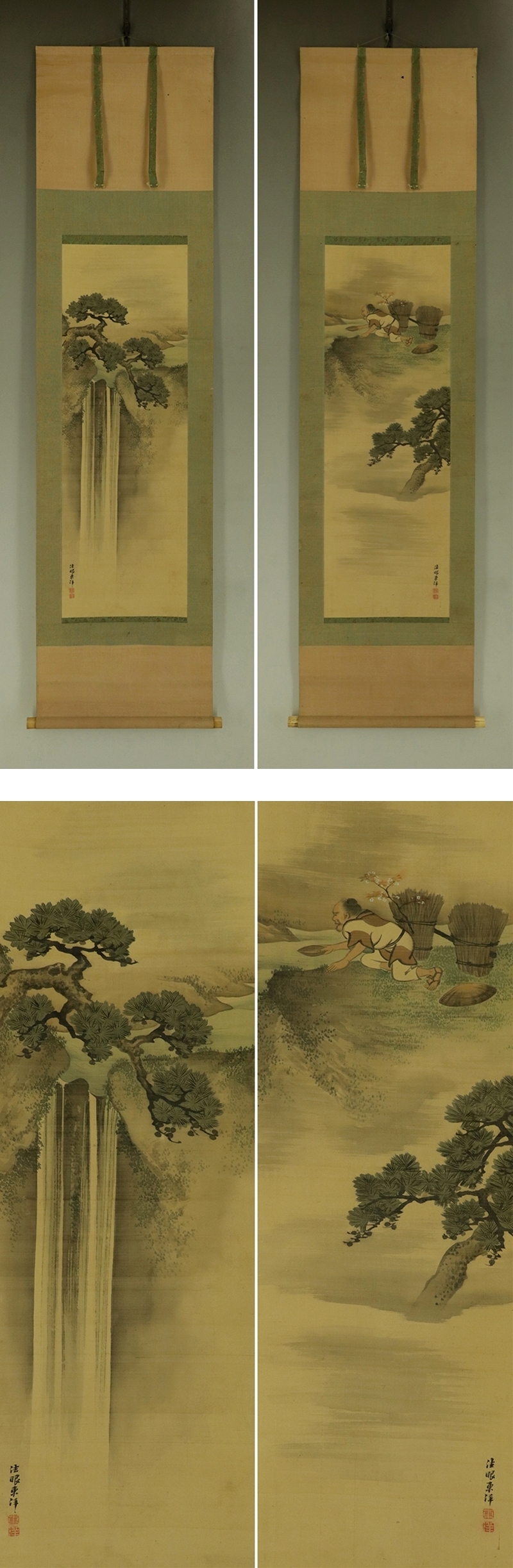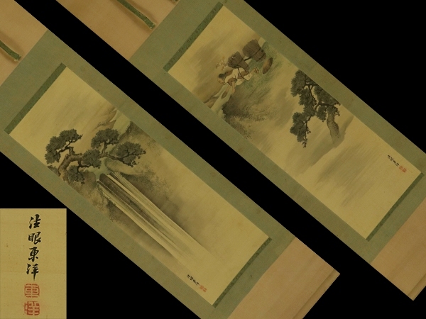 | №2306031【真作】東東洋【双幅・春景瀑布図】◆絹本◆合箱◆掛軸 | |
