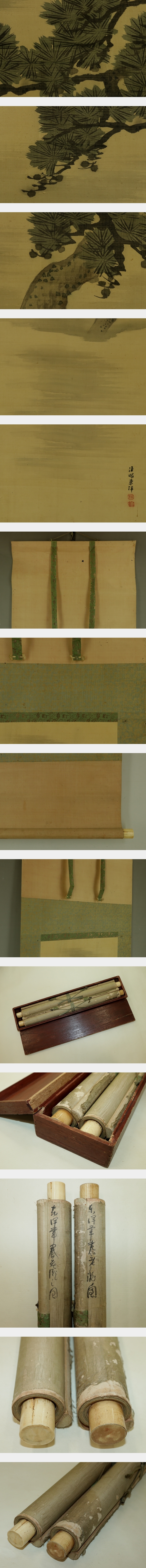 東東洋 あずま-とうよう(1755-1839) 江戸時代中期-後期の画家。 宝暦5年生まれ。京都で狩野梅笑に狩野派を学び,のち四条派の松村月渓の門に入る。 法眼に進み,晩年は帰郷して陸奥仙台藩の絵師となった。 天保10年11月23日死去。85歳。陸奥栗原郡(宮城県)出身。 名は洋。字は大洋。通称は俊太郎,儀蔵。別号に玉峨,白鹿園。 本紙は、染み、汚れ、軽い折れ、皺、浮き、ヤケがあります。 表装は、染み、汚れ、折れ、皺、虫食い、破れ、ほつれ、剥れ、 軸先に汚れ、左右の種類が違い、箱に破損、軸紐に劣化があります。 【サイズ】 作品 横約33cm×縦約98cm 表装 横約46cm×縦約177cm |