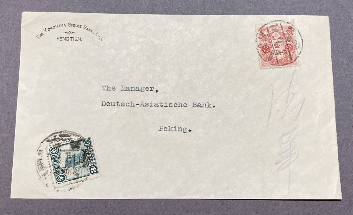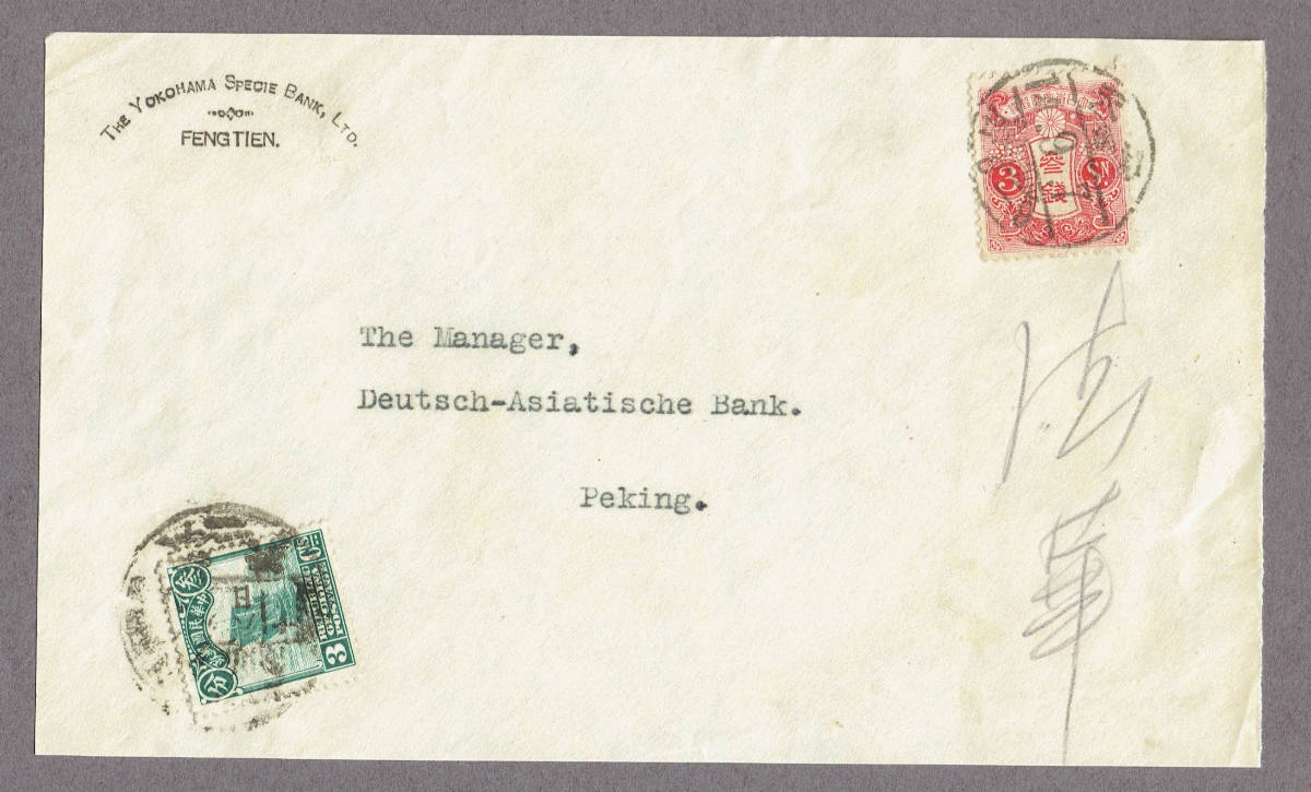フロントカバー。横浜正金銀行シェンヤン支店差出独亜(徳華)銀行北京支店宛。大正12年1月1日~大正14年10月31日 書状3銭、信函3分。日専郵便史・郵便印編の評価:40,000円。