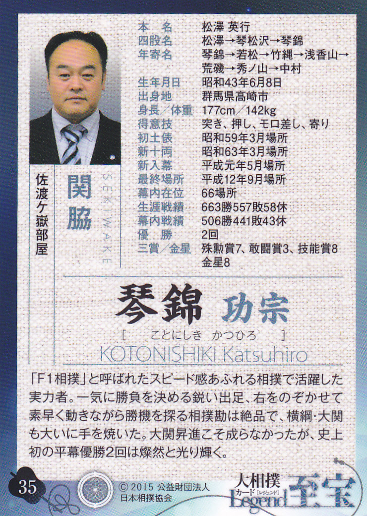 BBM2015大相撲カード[レジェンド]至宝 35 琴錦 佐渡ケ嶽部屋 関脇 群馬県高崎市