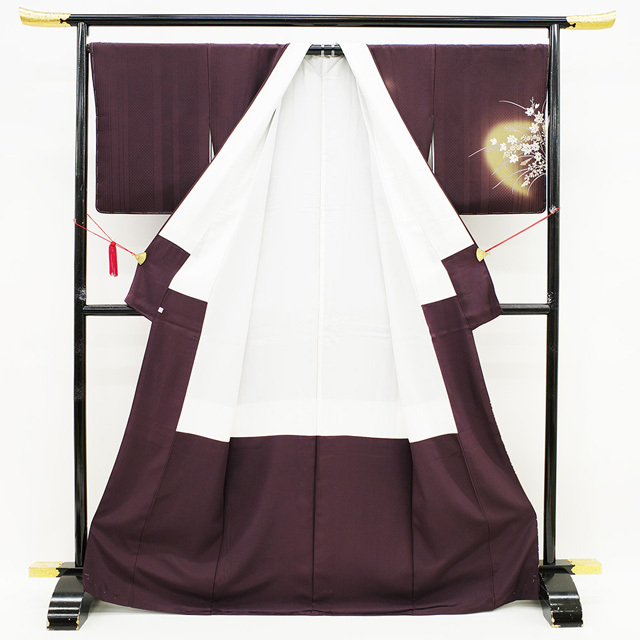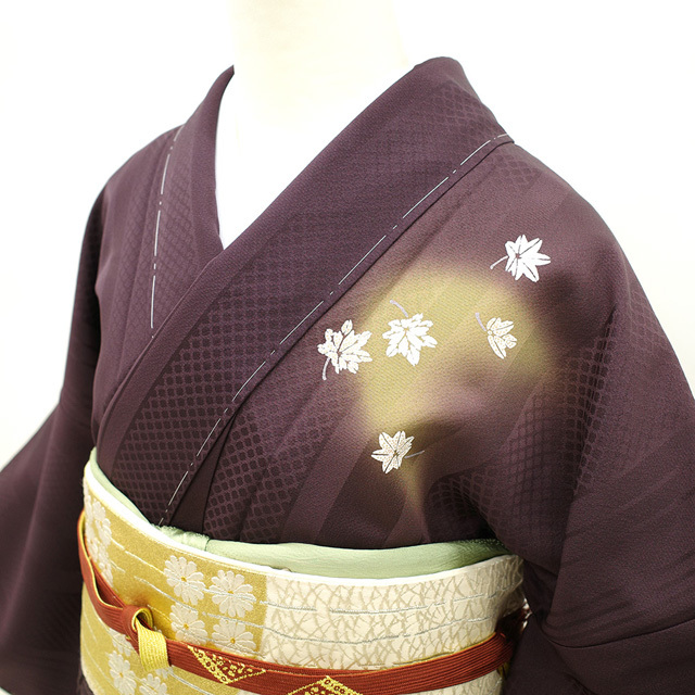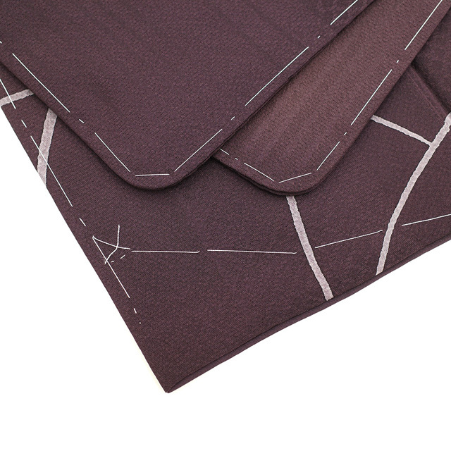 縞や菱の地紋が施されたこちらのお着物は、シックな濃紫色地。