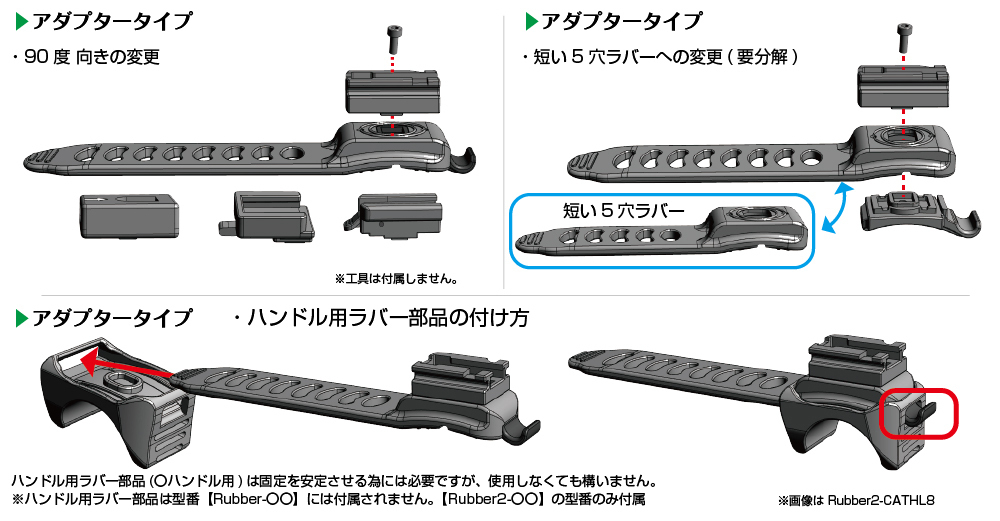 22.2mm / 25.4mm / 26.0mm / 28.6mm / 31.7mm / 31.8mm / 35.0mmの規格サイズや、ステム一体型のエアロハンドル・異形のハンドルにも取付可能なロングタイプのゴムバンドが付属。