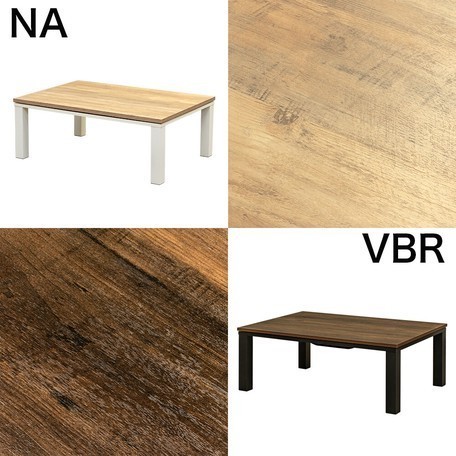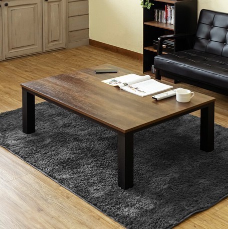 重厚な木目調天板とその雰囲気を引き立てるブラック脚が特徴のシックなコタツです。